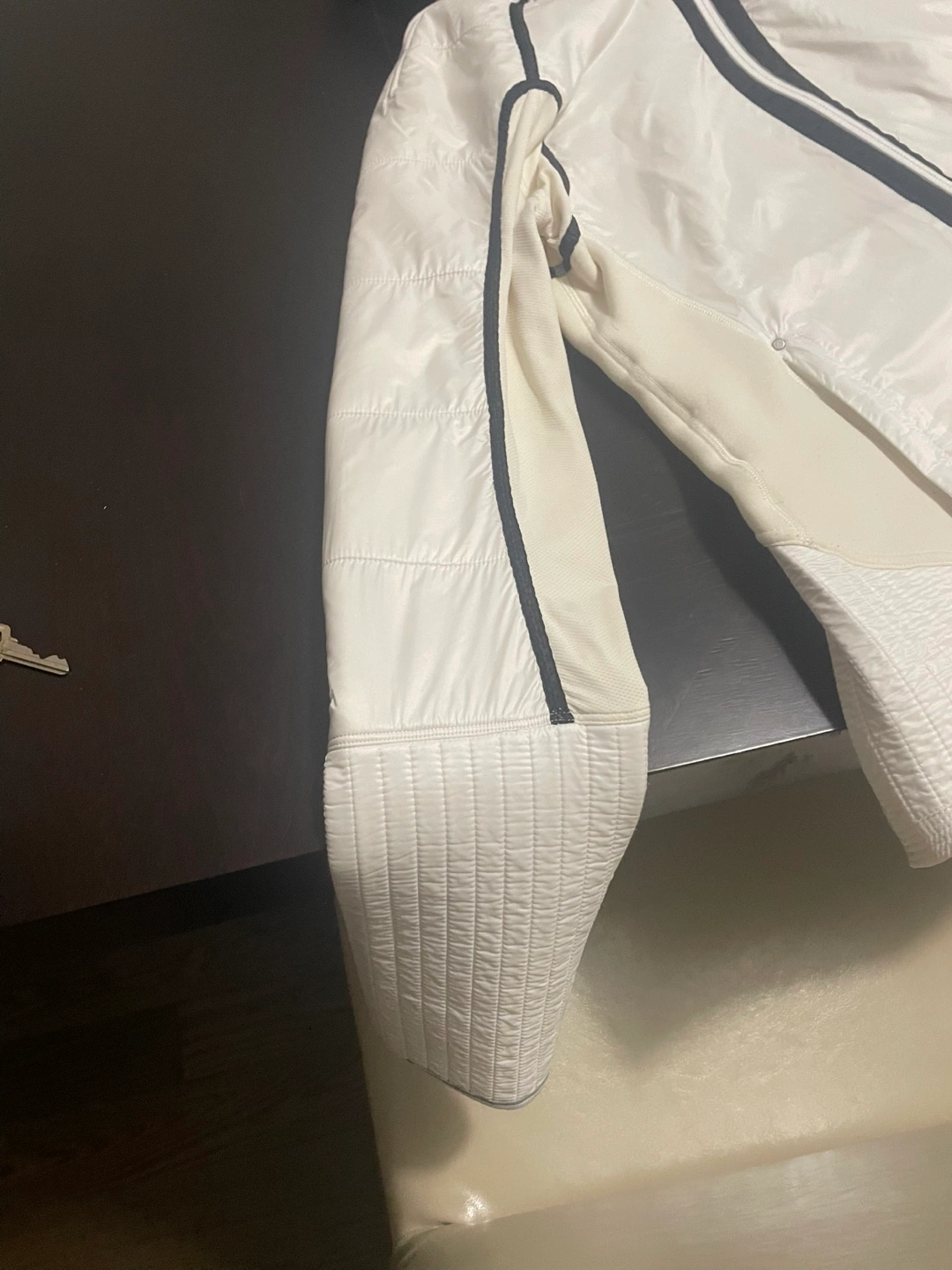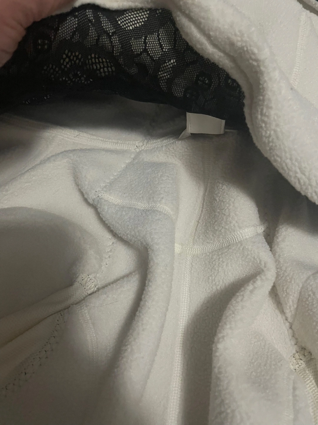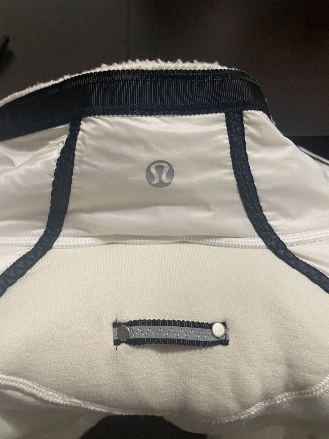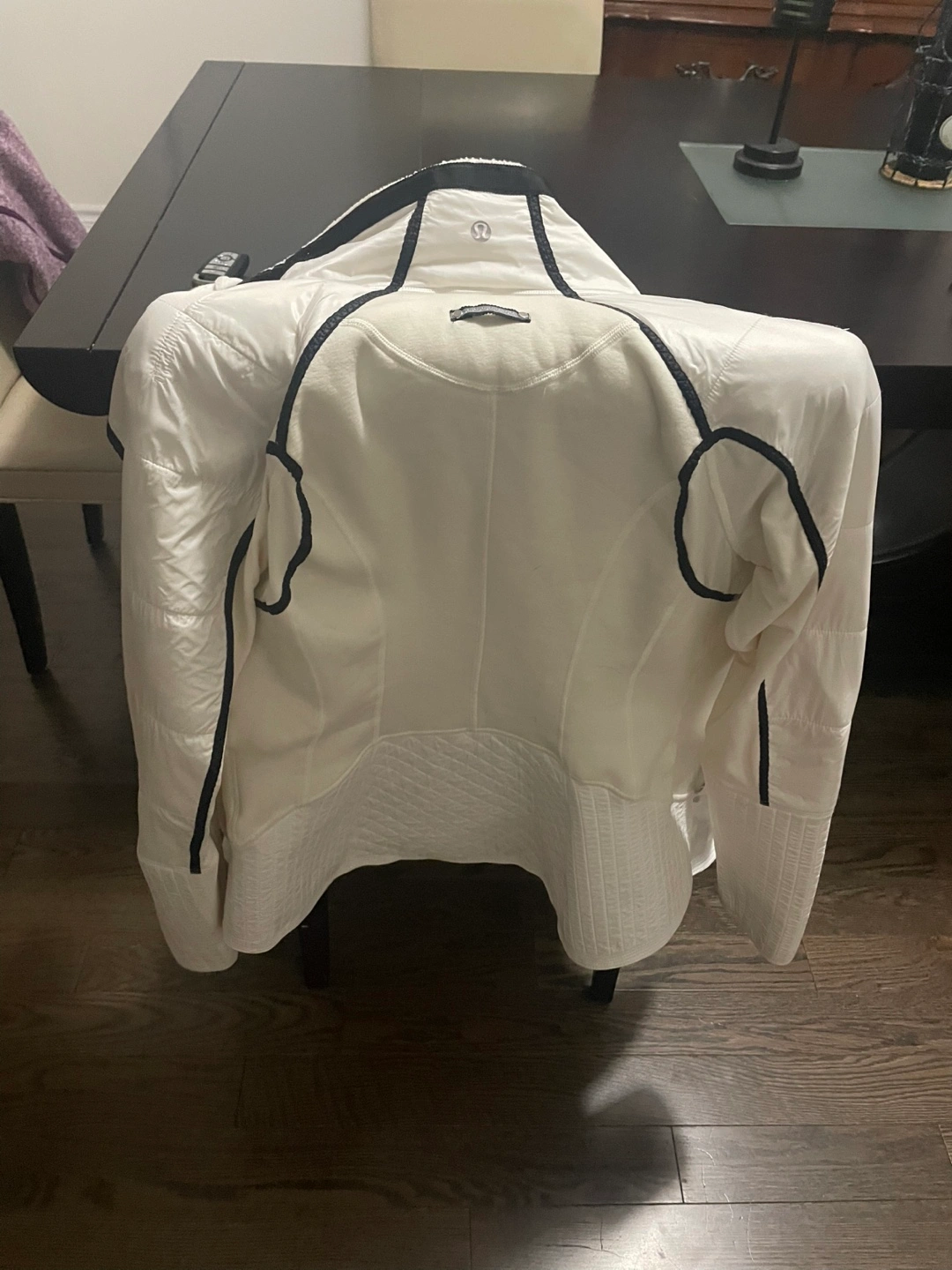 Selling a Lululemon jacket in white/cream. It's in great shape and ready for a new home! The jacket features a unique design with black lace detailing and quilted accents. Perfect for layering or wearing on its own during fall or cooler weather. Hood and lace front both can be removed leaving the jacket only.