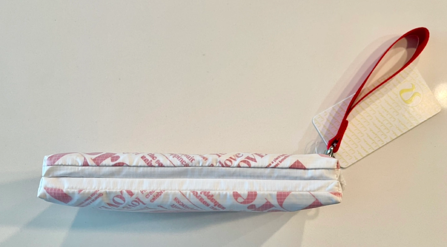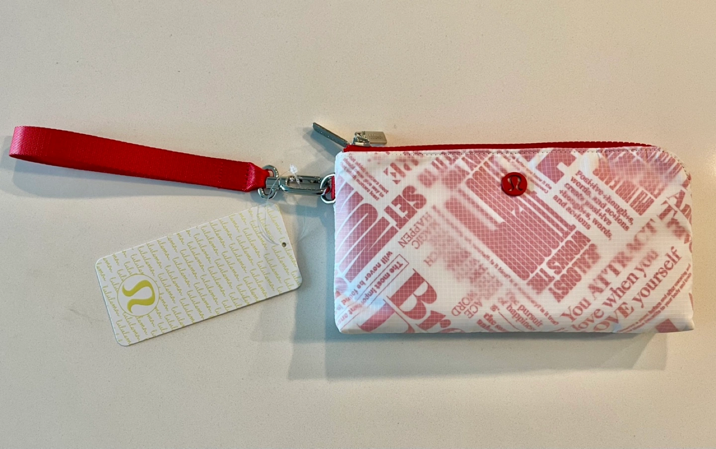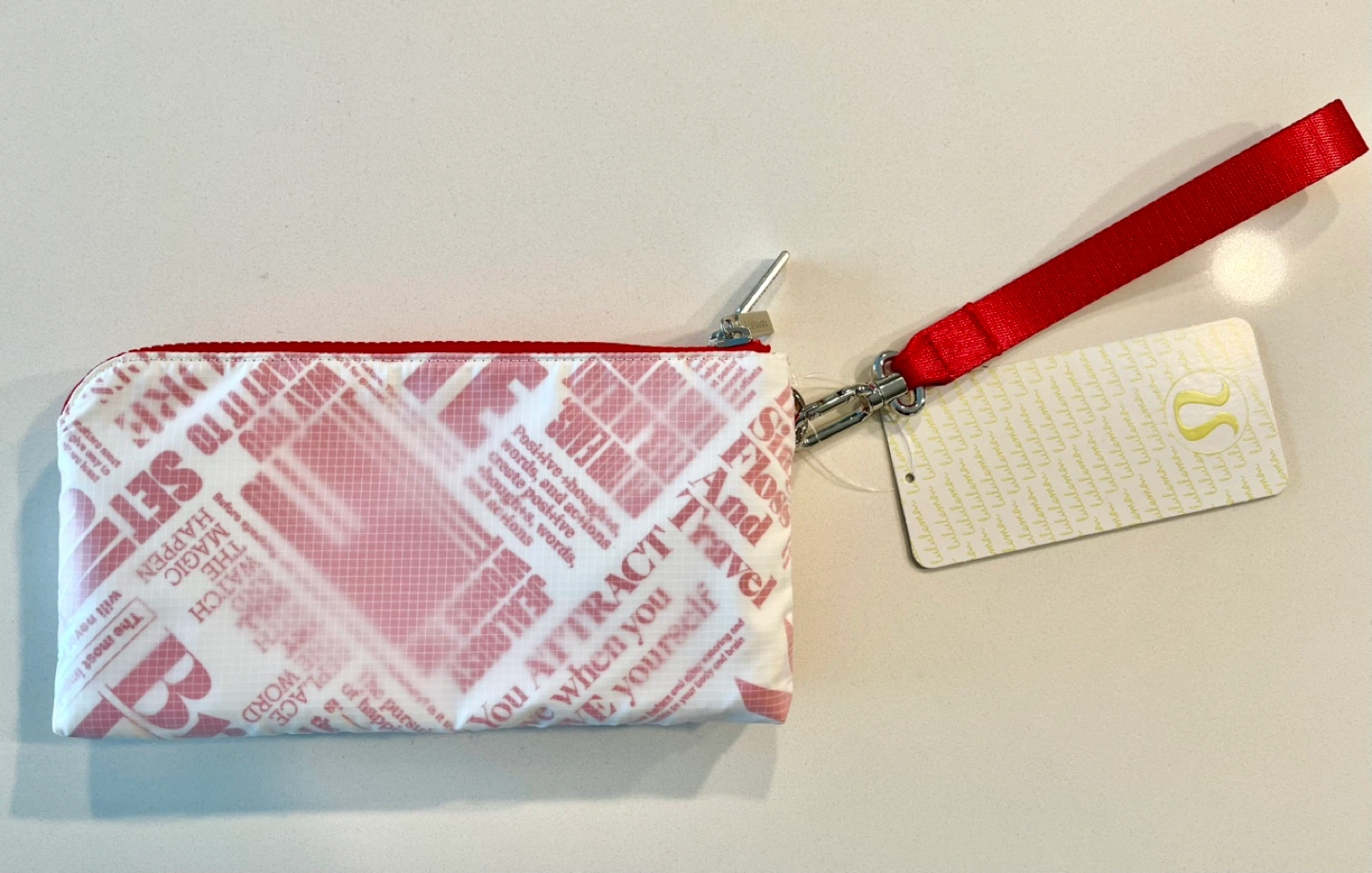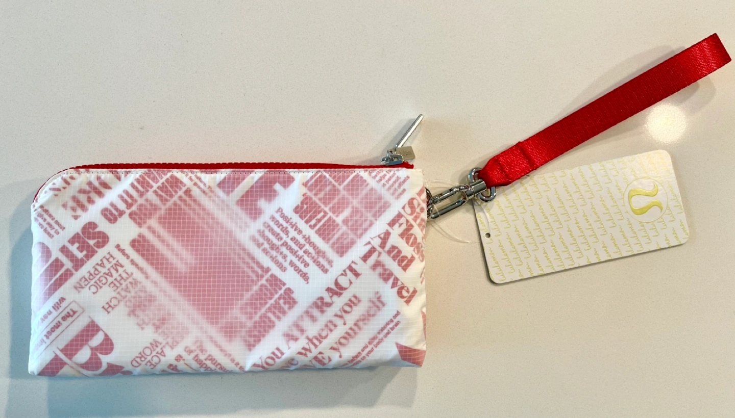 44Lululemon Red and White Newspaper Print Zip Pouch Lululemon zippered pouch (wallet). Limited edition Discontinued Red zipper and wristlet strap. Newspaper print design. Waterproof. New with tag. Retail price ; CAD $55