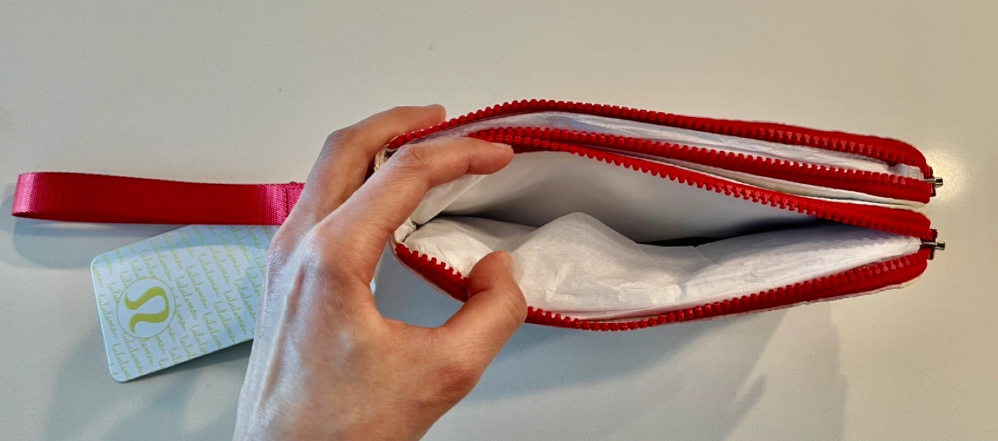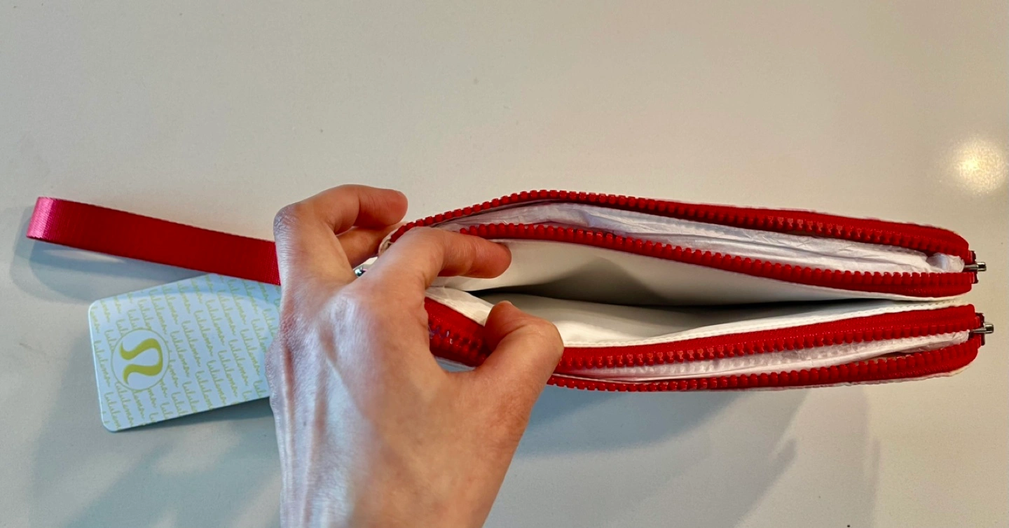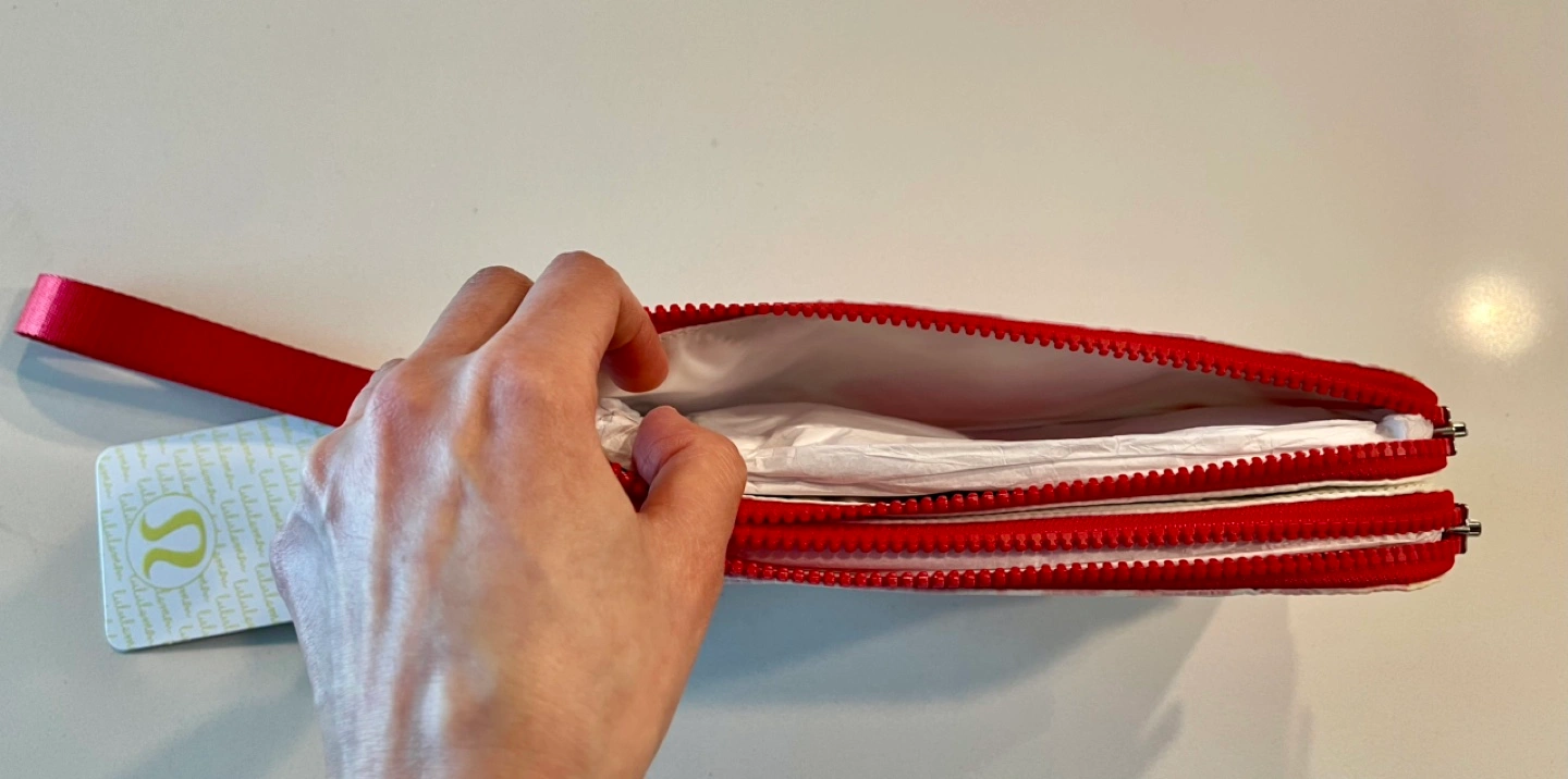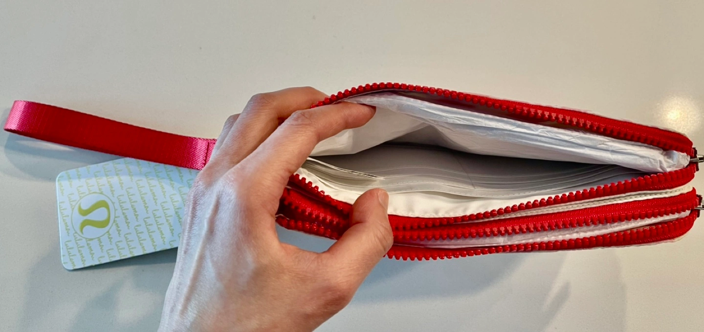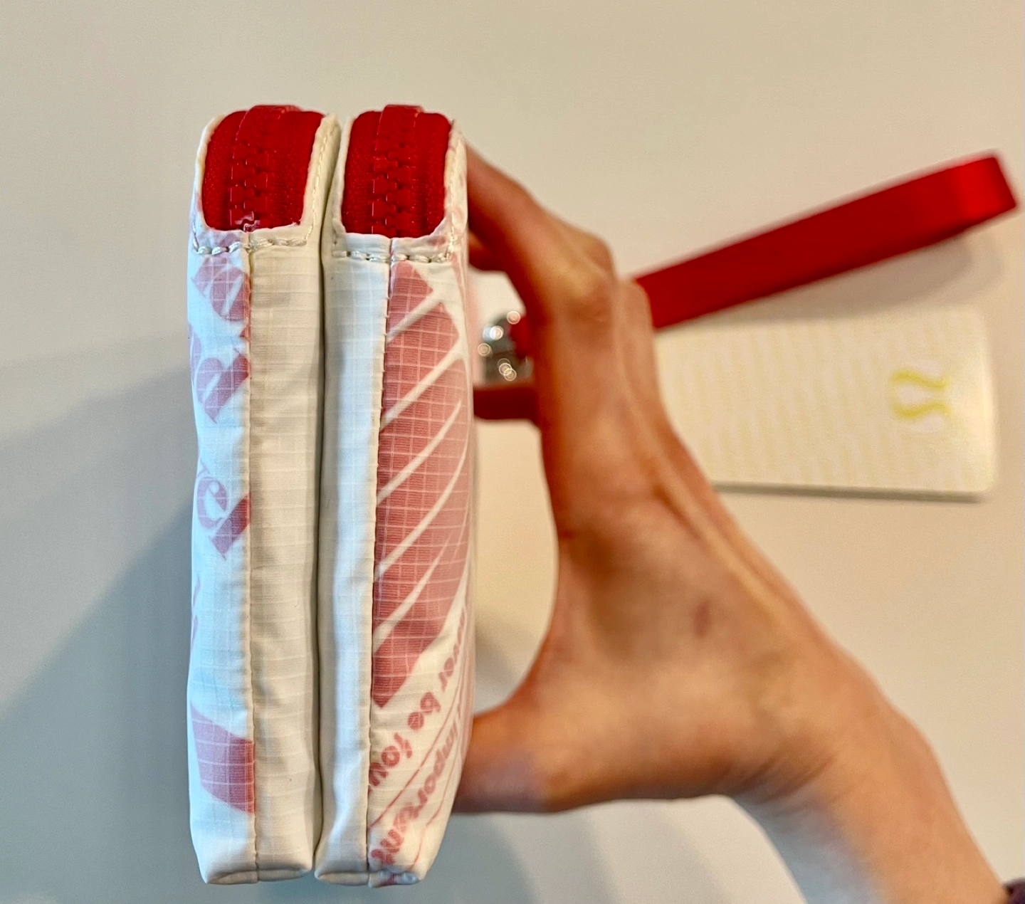 44Lululemon Red and White Newspaper Print Zip Pouch Lululemon zippered pouch (wallet). Limited edition Discontinued Red zipper and wristlet strap. Newspaper print design. Waterproof. New with tag. Retail price ; CAD $55