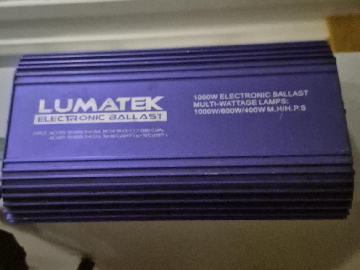60Selling a Lumatek 1000W Electronic Ballast. It supports multi-wattage lamps: 1000W/600W/400W M.H/H.P.S.
