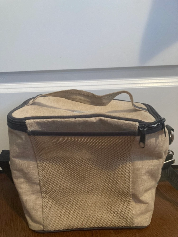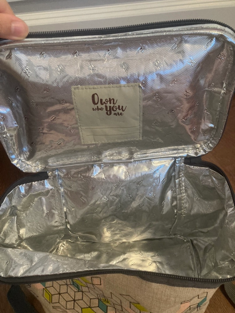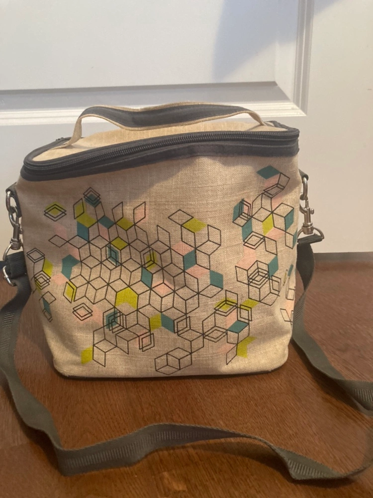 A beige lunch bag with a geometric pattern and a shoulder strap. It is insulated and has a mesh pocket on the side. It also has a strap for easy carry.