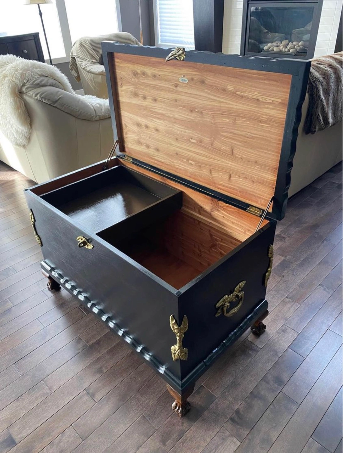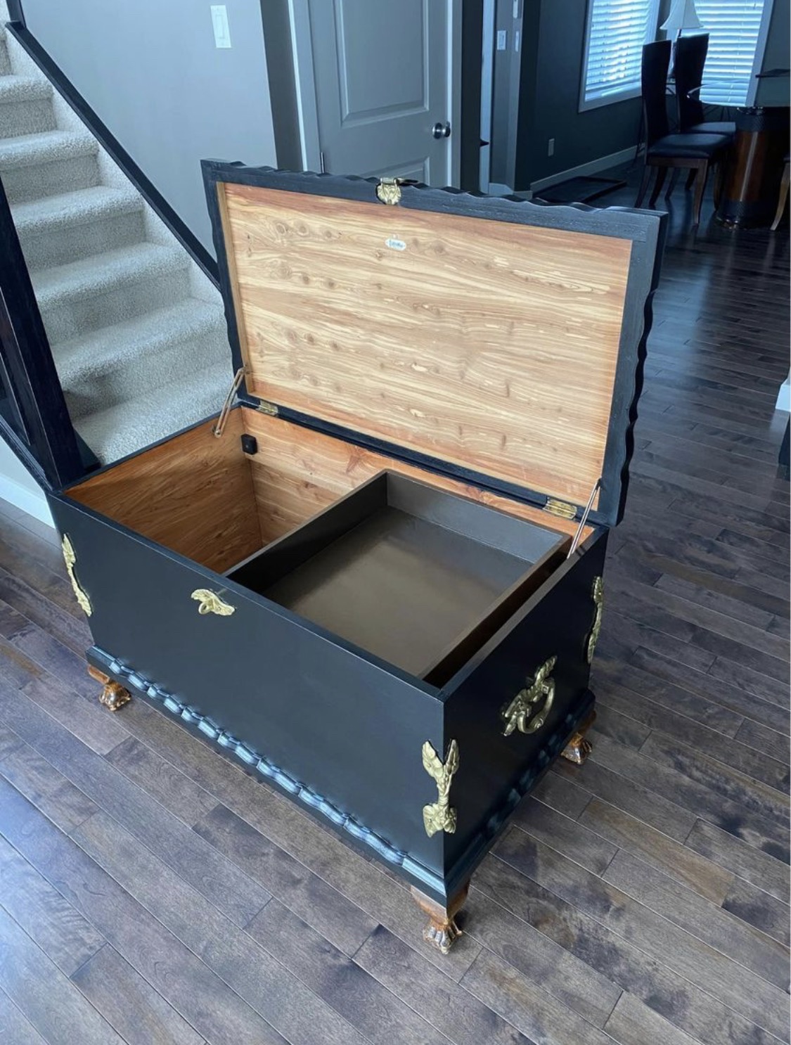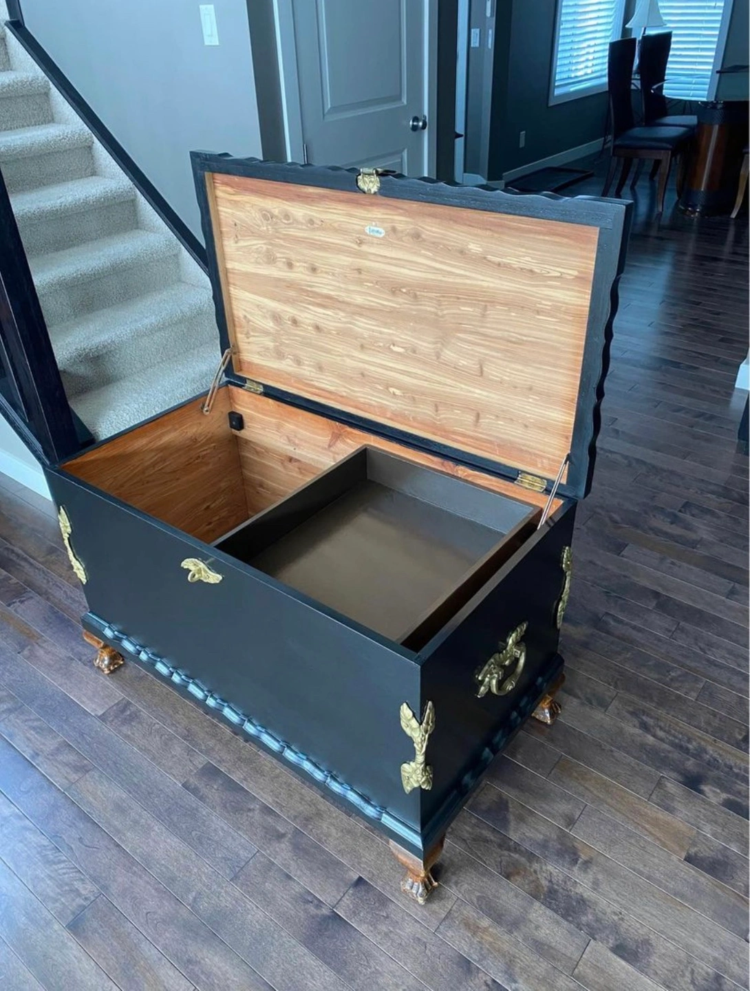 15๐ Clean and fully restored like a New for your luxury home ๐ฅCedar lined ๐ one extra drawer in side ๐ก Applied a superior coating to get the anti-scratch ๐จ low gloss black colour ๐ Measured dimensions are provided in โฆ Length 40 inches, width 22 inches and height 26 inches ๐ก Well taken care of in a non-smoking and pet-free home. ๐บ Pick up in Chaparral valley SE. ๐ฐ Cash only (not acceptable E-transfer) ๐ Pre-deposit for holding ๐ Delivery Come and pre-pay for delivering. Delivery can be arranged but will be subjected to additional charges $50 in Calgary ๐ Please see my other items on my listings for more your choices. ๐ โsnowfreethereโ on Instagram