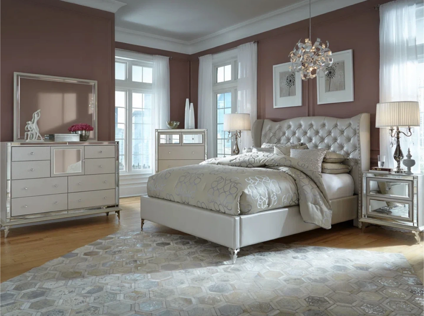73ποΈ Included Items: β’ 1 Γ Hollywood Swank Upholstered Bed β’ 1 Γ Hollywood Loft Dresser & Mirror Set β’ 2 Γ Hollywood Loft Upholstered Nightstands β’ 1 Γ High-End Mattress β’ 1 Γ Mattress Box Designed by Michael Amini and Jane Seymour, blends Hollywood glamour with modern elegance.