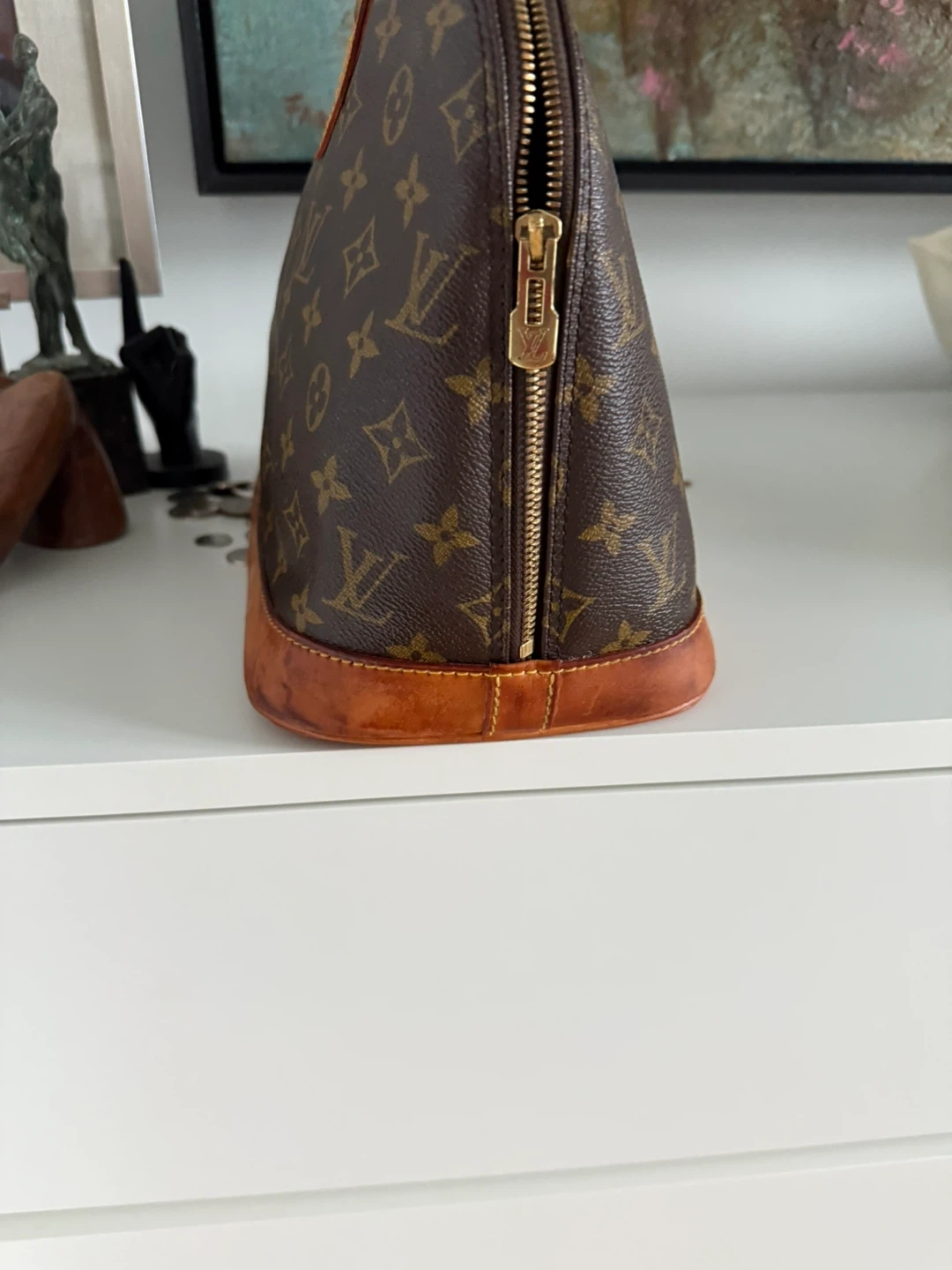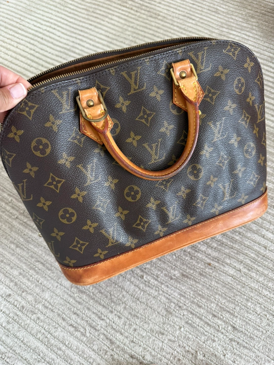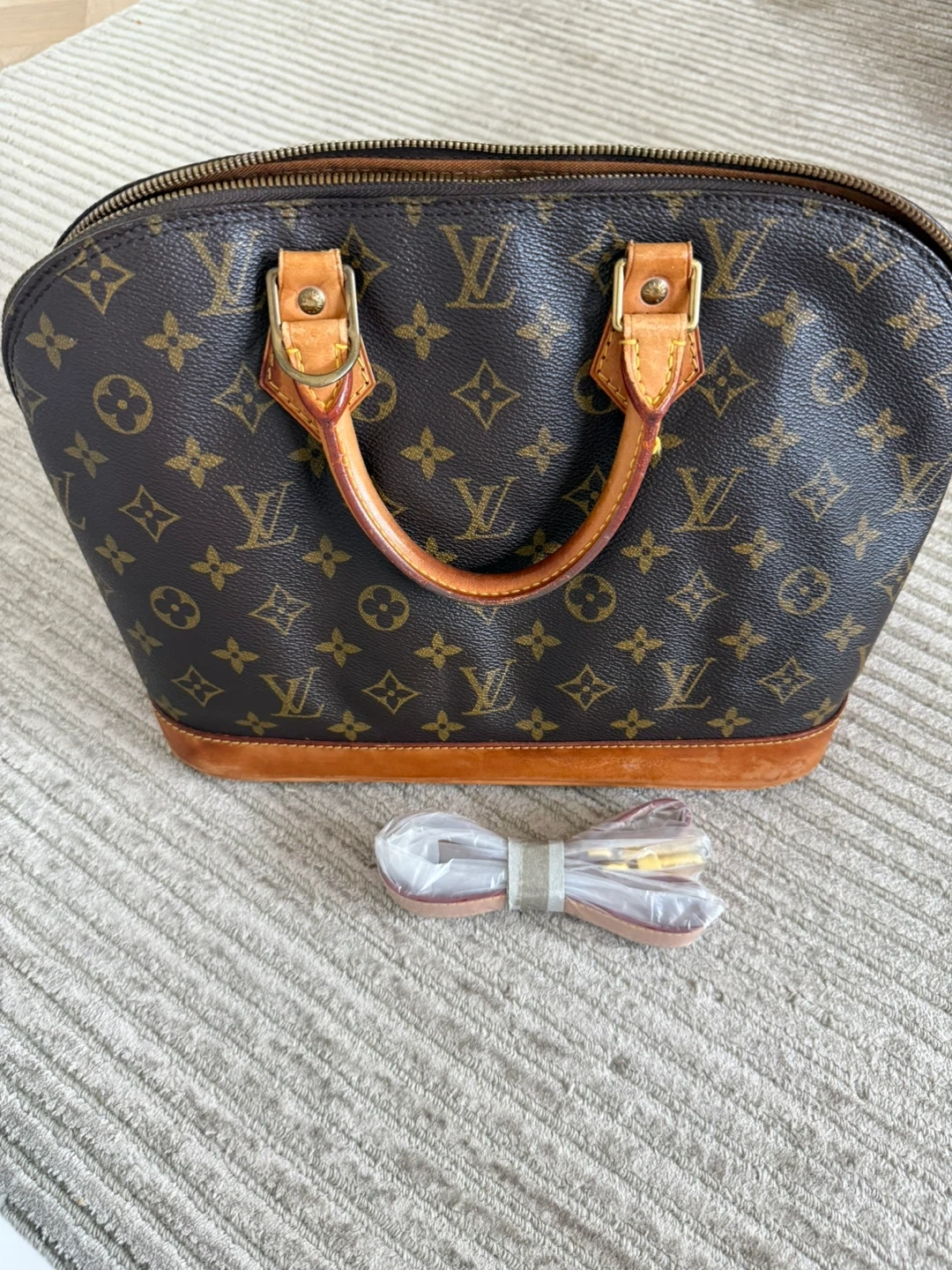 A classic LV Alma PM bag. Bought it years ago and is well loved. I just don’t use it anymore. In great shape, clean and no stains in or on inside lining. See photos. #VI 1926 There are normal vintage wear on the vacchetta leather trim handles and small water marks in base that commensurate with the age of the bag. Original packaging for the long strap that can be made into cross body.