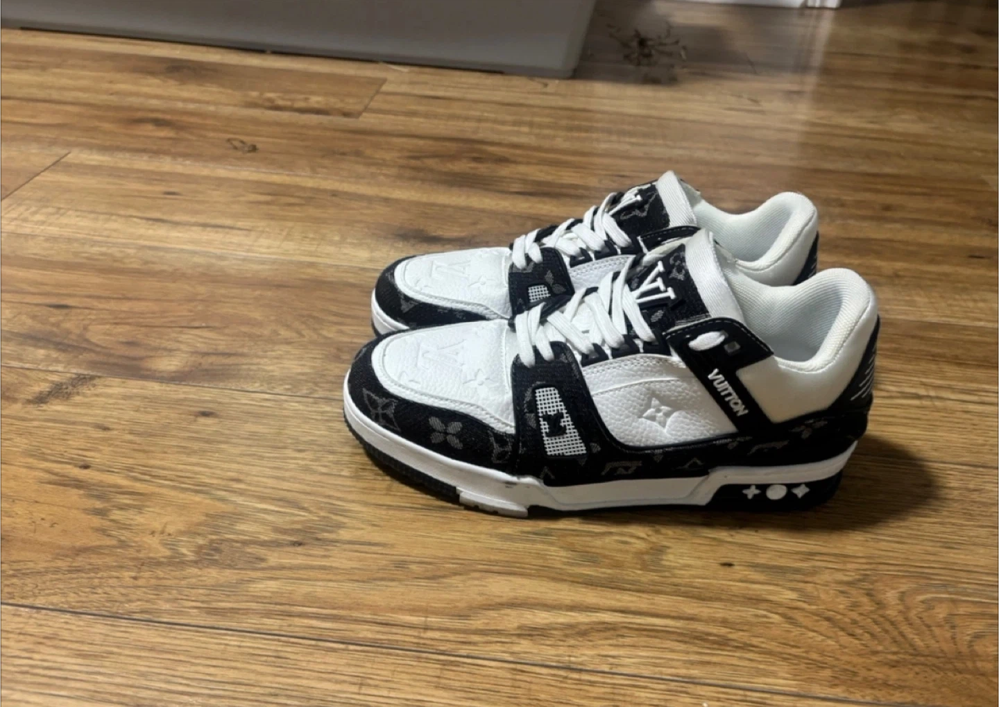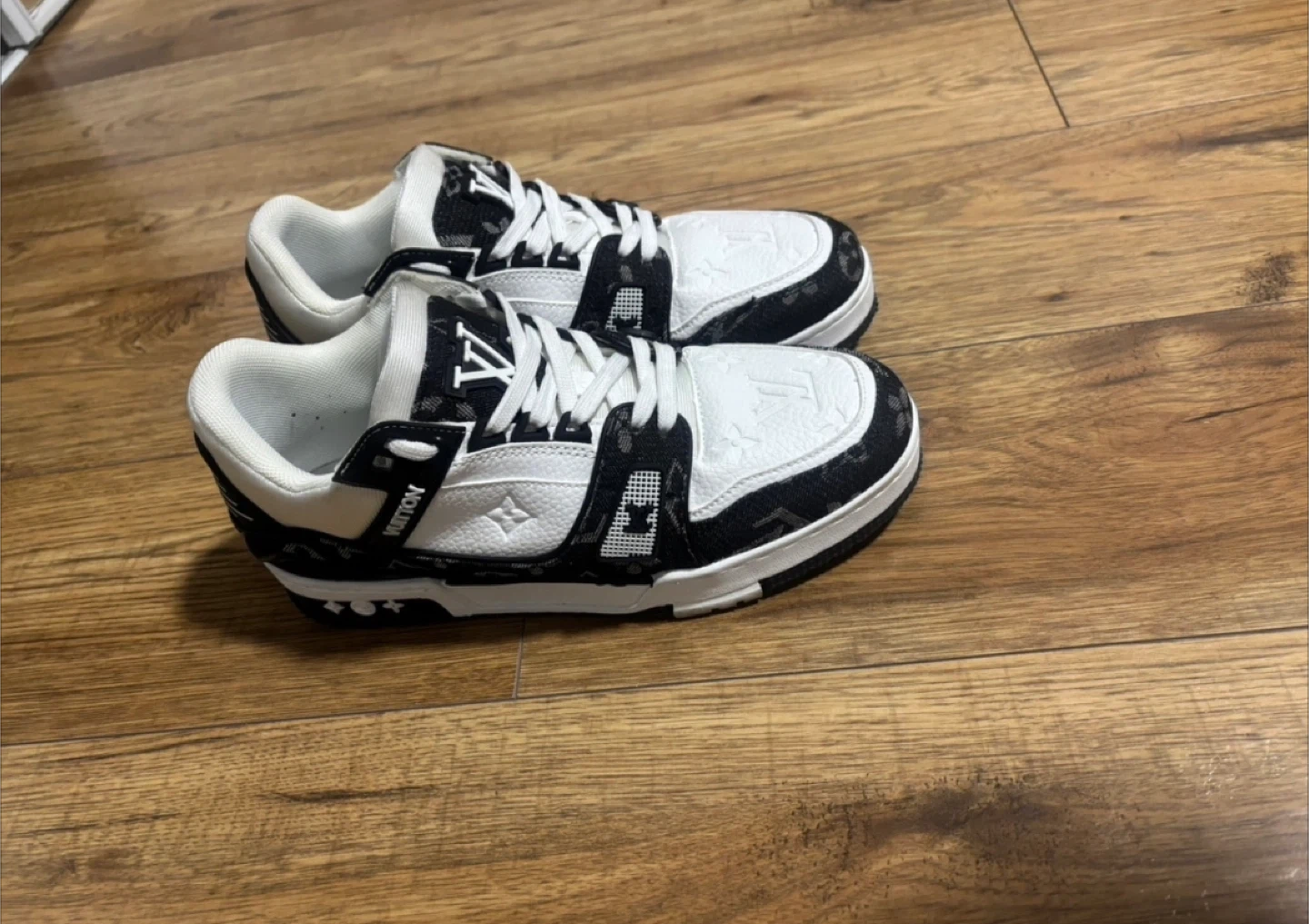 Selling a pair of Louis Vuitton low top sneakers in white and black. These sneakers feature the iconic LV logo and a stylish design. Great for adding a touch of luxury to your everyday look! 1:1