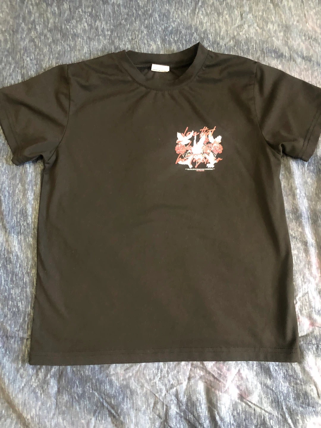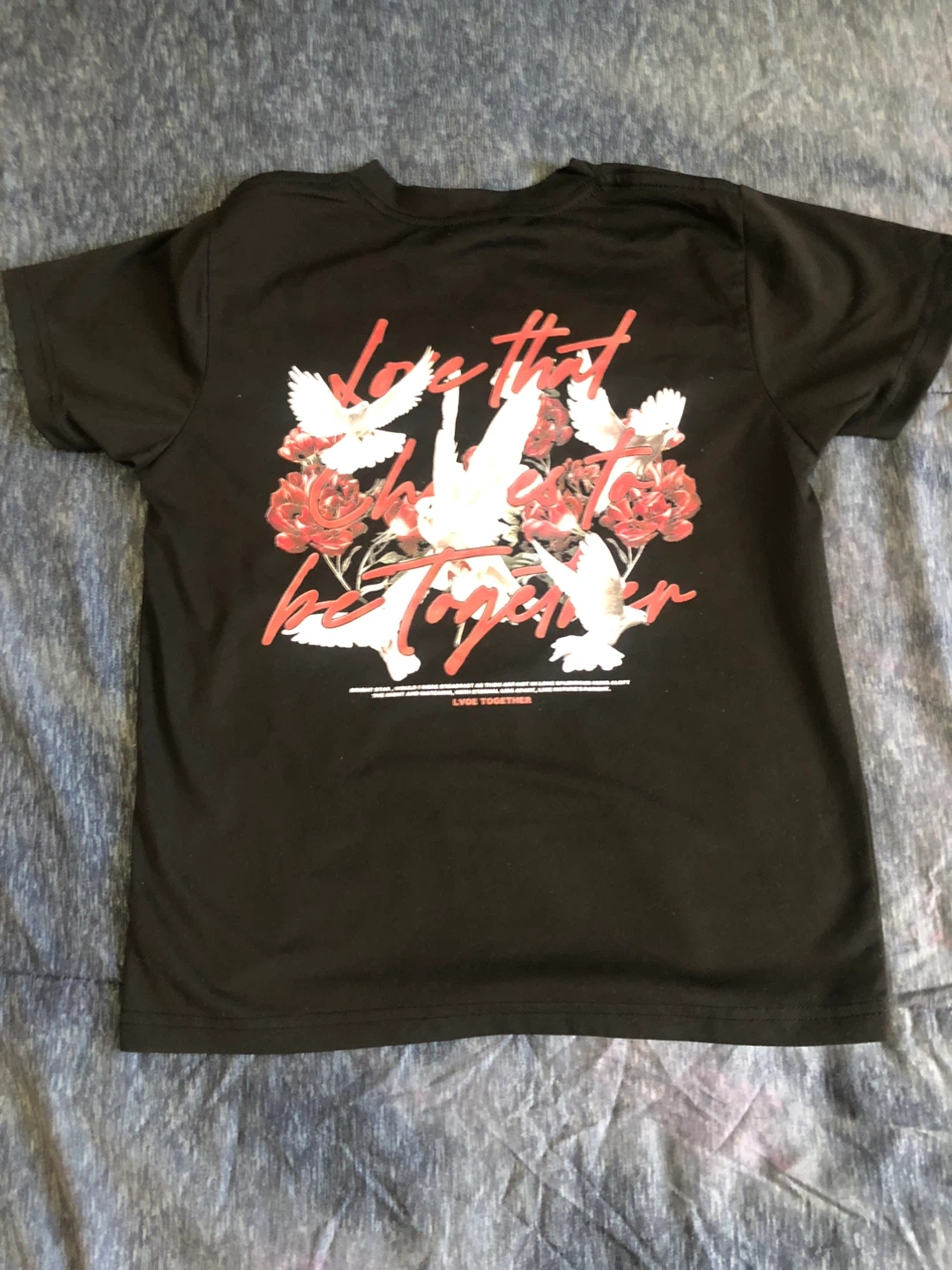 15Selling a black LYDC Together t-shirt. It features a unique design with doves and roses. The material feels lightweight and comfortable, perfect for everyday wear! Kids