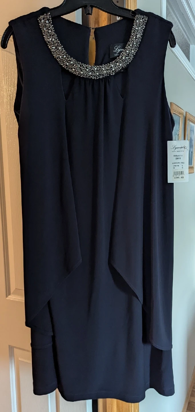 60Selling a beautiful New Frank Lyman dress in size 12. Retail is over $200. It's a lovely navy blue and features elegant beaded detailing around the neckline. Perfect for a special occasion or a night out!