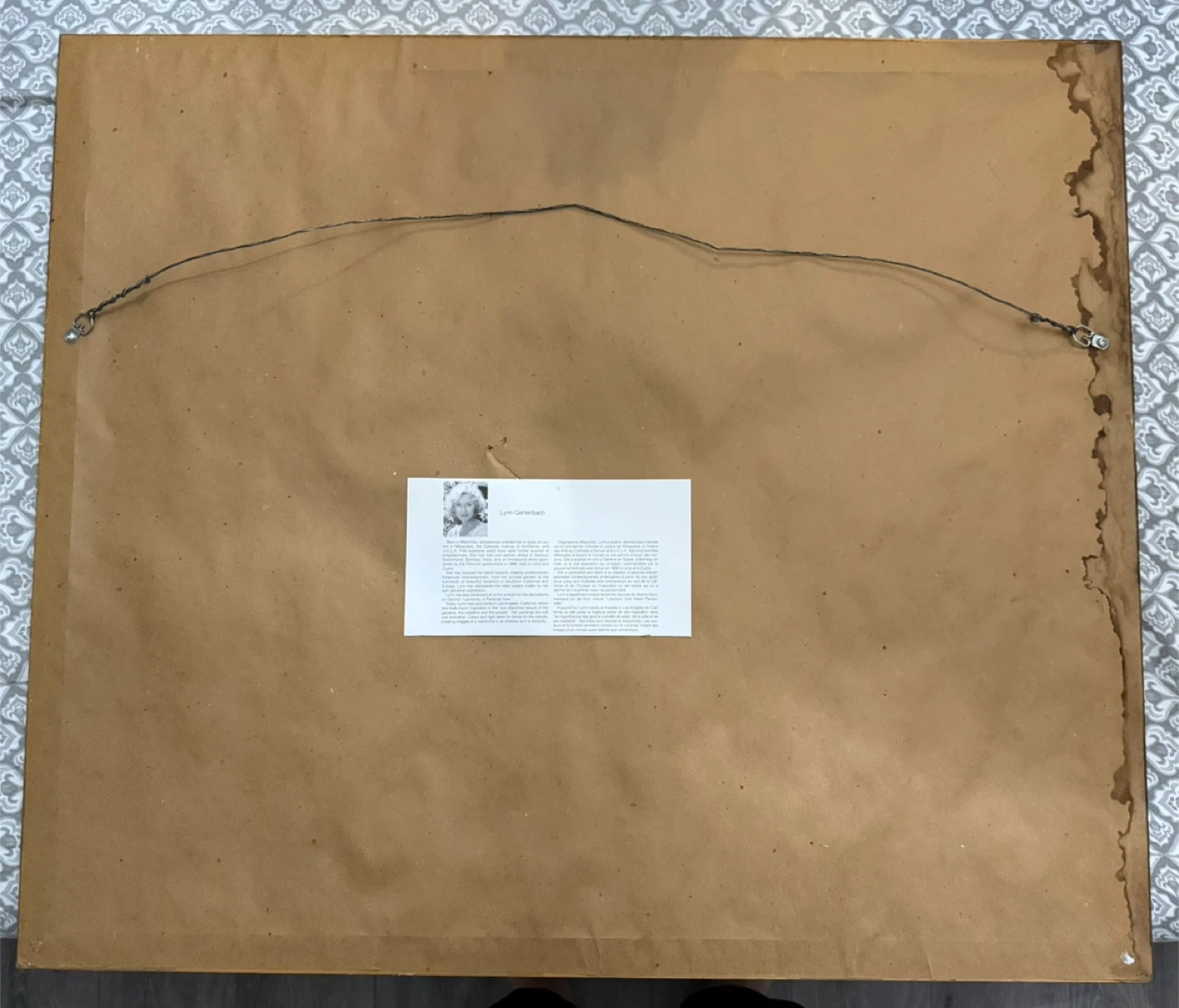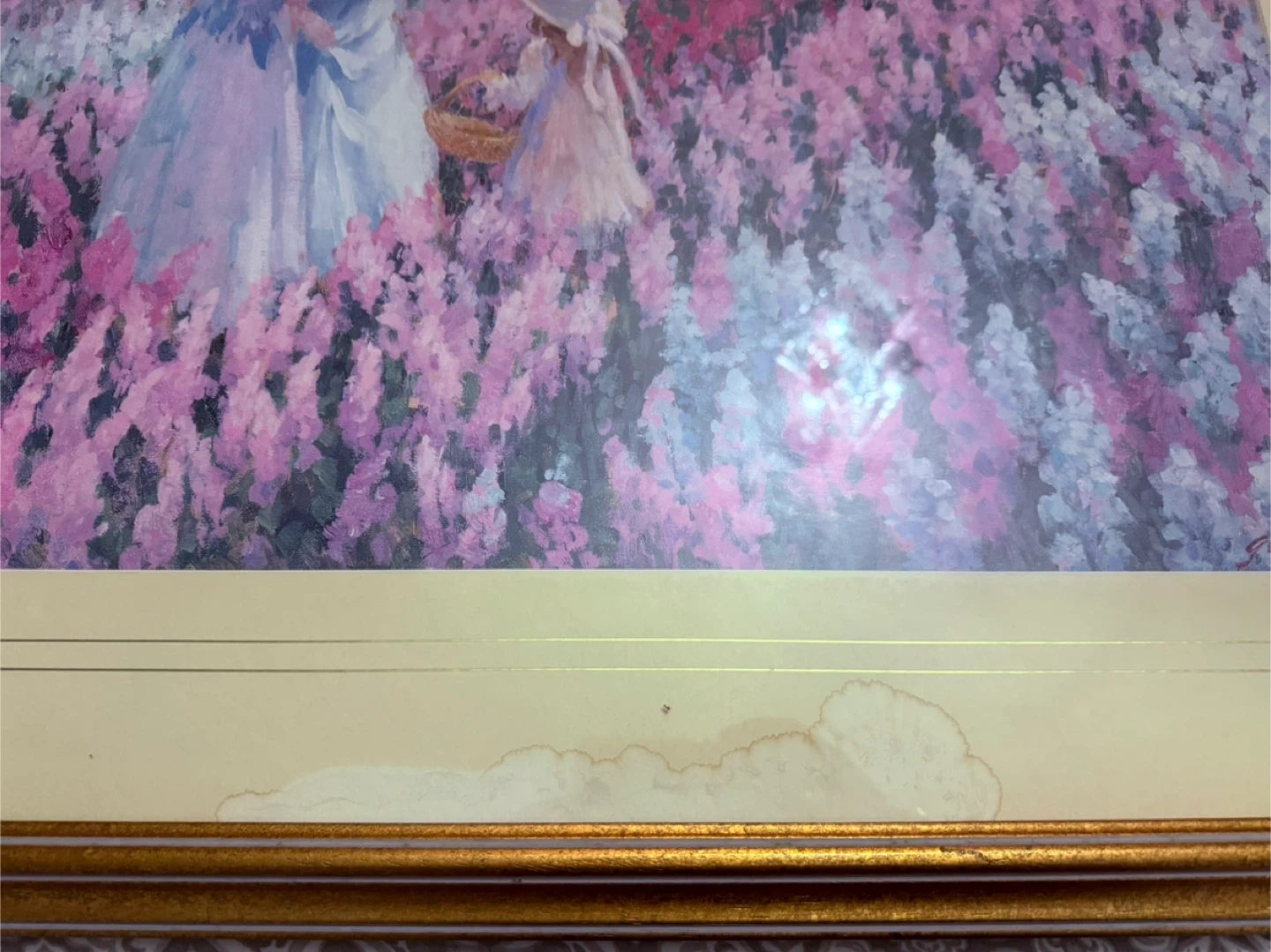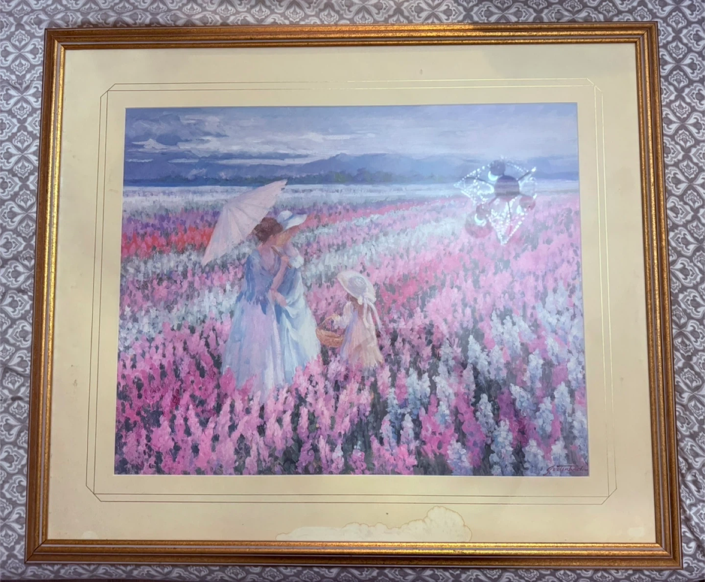 Selling a framed print by Lynn Gertenbach. It's a lovely piece depicting figures in a field of flowers. The frame has some wear and tear, as shown in the photos, but the print itself is in good condition 34.5” x 29.5”