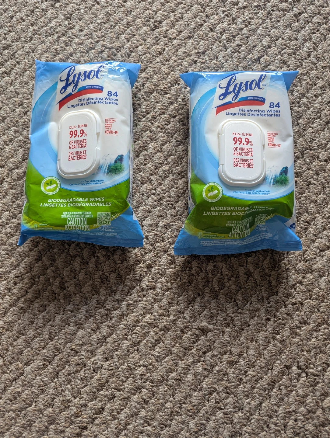 37two packs of Lysol Disinfecting Wipes. Each pack contains 84 wipes and kills 99.9% of viruses and bacteria. They're biodegradable wipes and are in new condition!