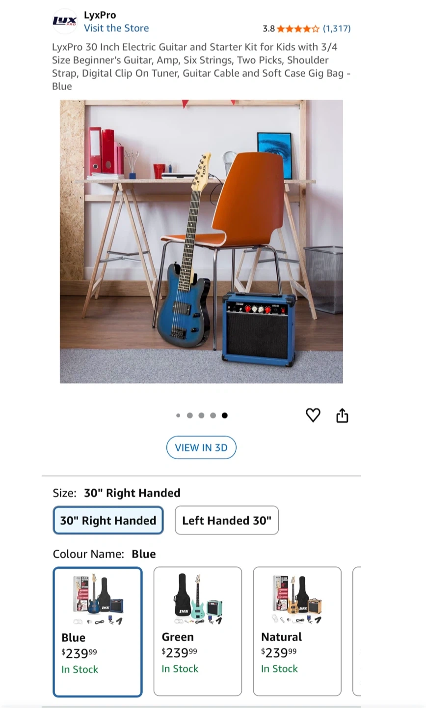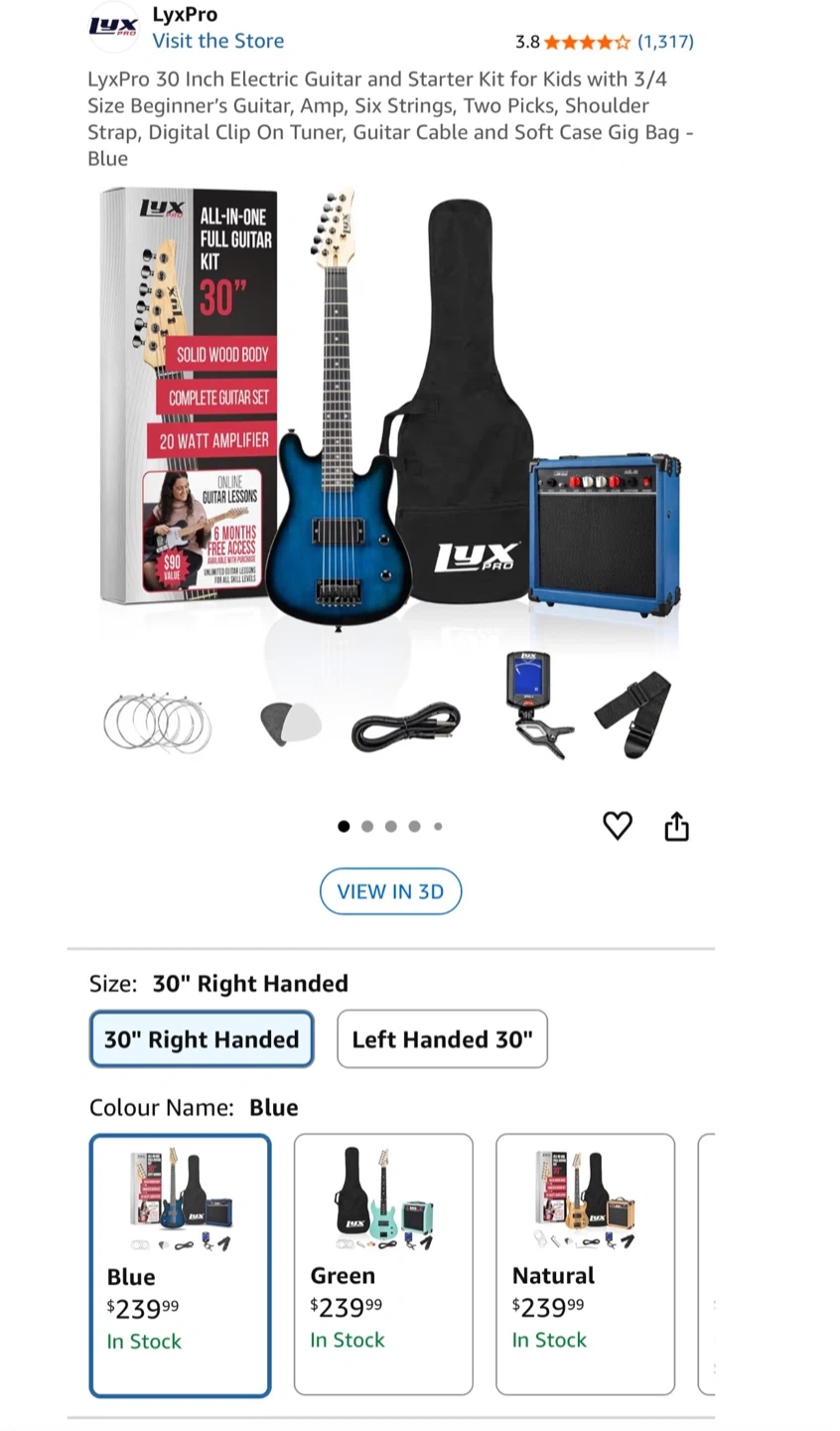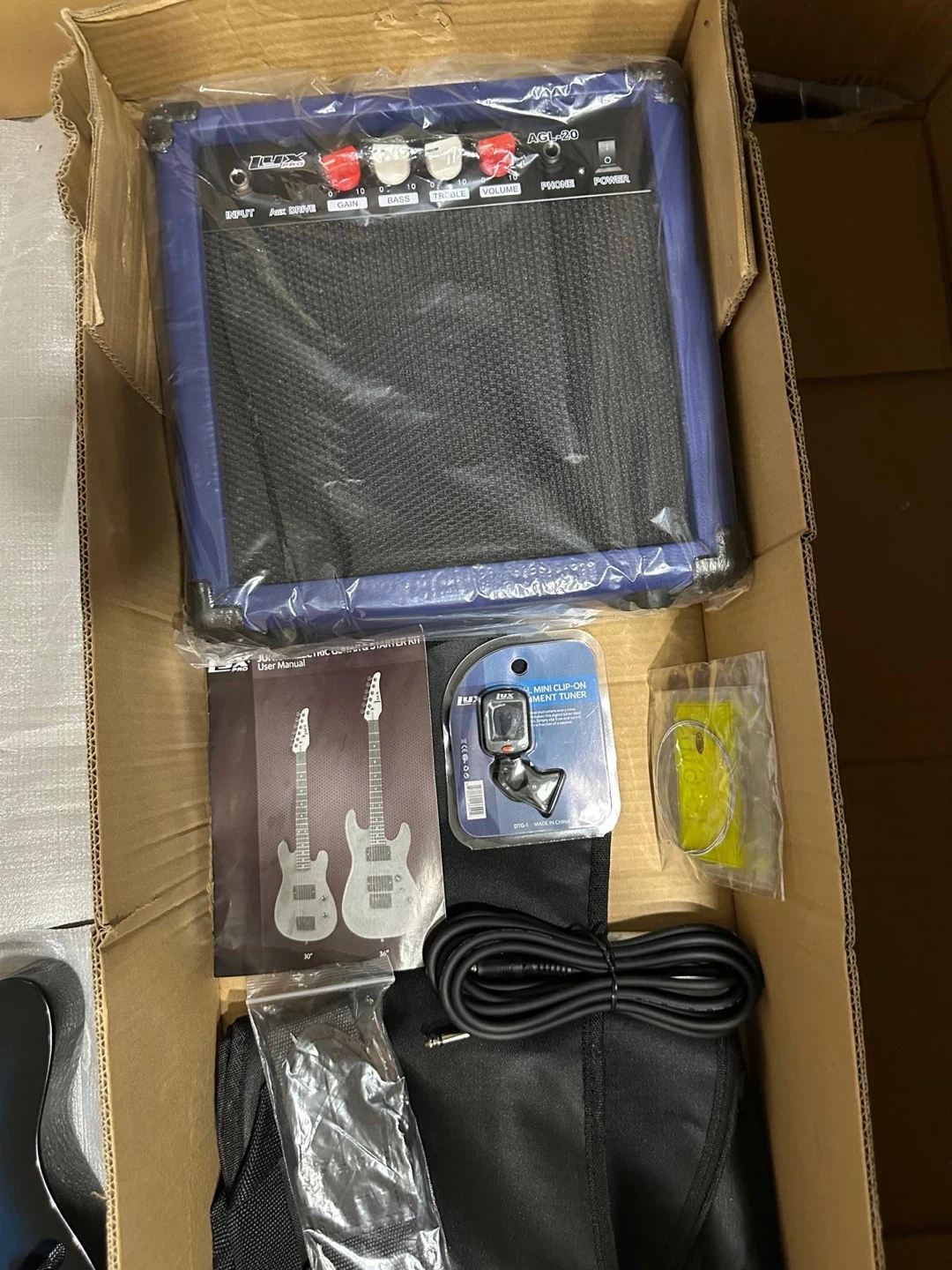 73Selling a LyxPro 30-inch electric guitar and starter kit in blue! This right-handed guitar comes with everything you need to get started. Included in the box: - 3/4 size beginner's guitar - Amp - Six strings - Two picks - Shoulder strap - Digital clip-on tuner - Guitar cable - Soft case gig bag