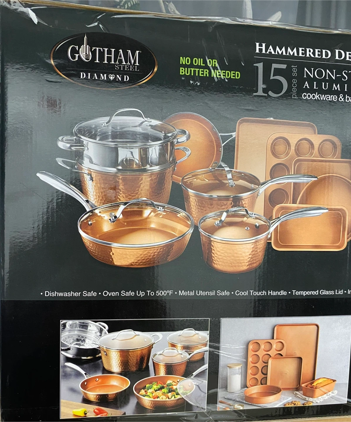 This 15-piece cookware and bakeware set from Gotham Steel features a hammered copper design.