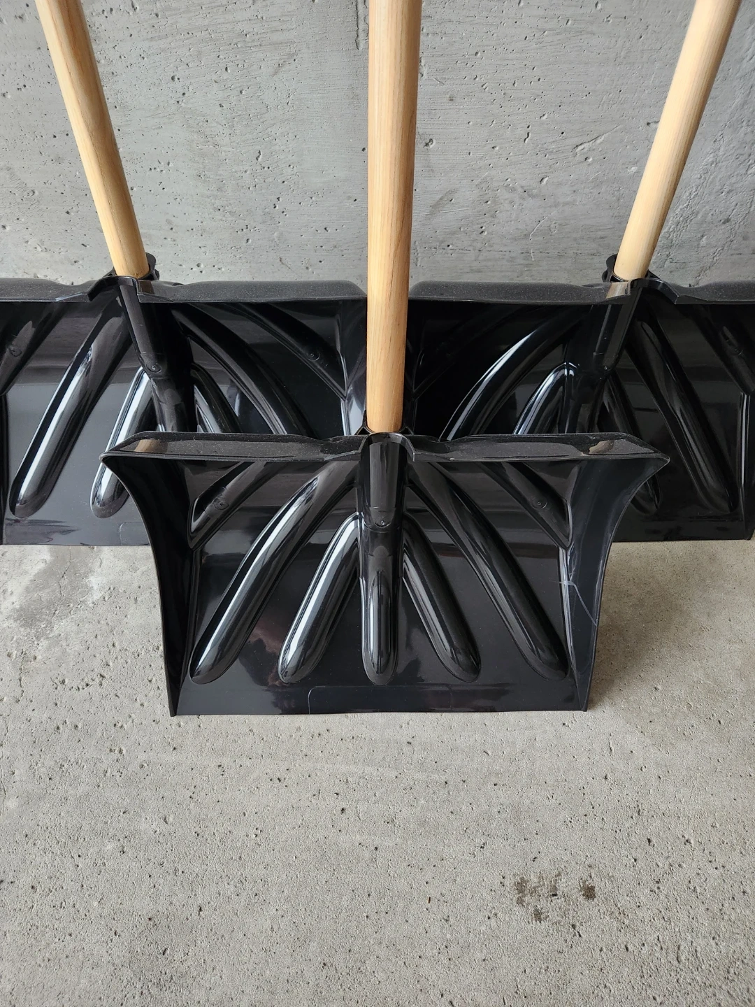 Four Available black snow shovels with wooden handles and ergonomic grips. These shovels are made of durable plastic for clearing snow. Great for winter snow removal! Size 18 " inches