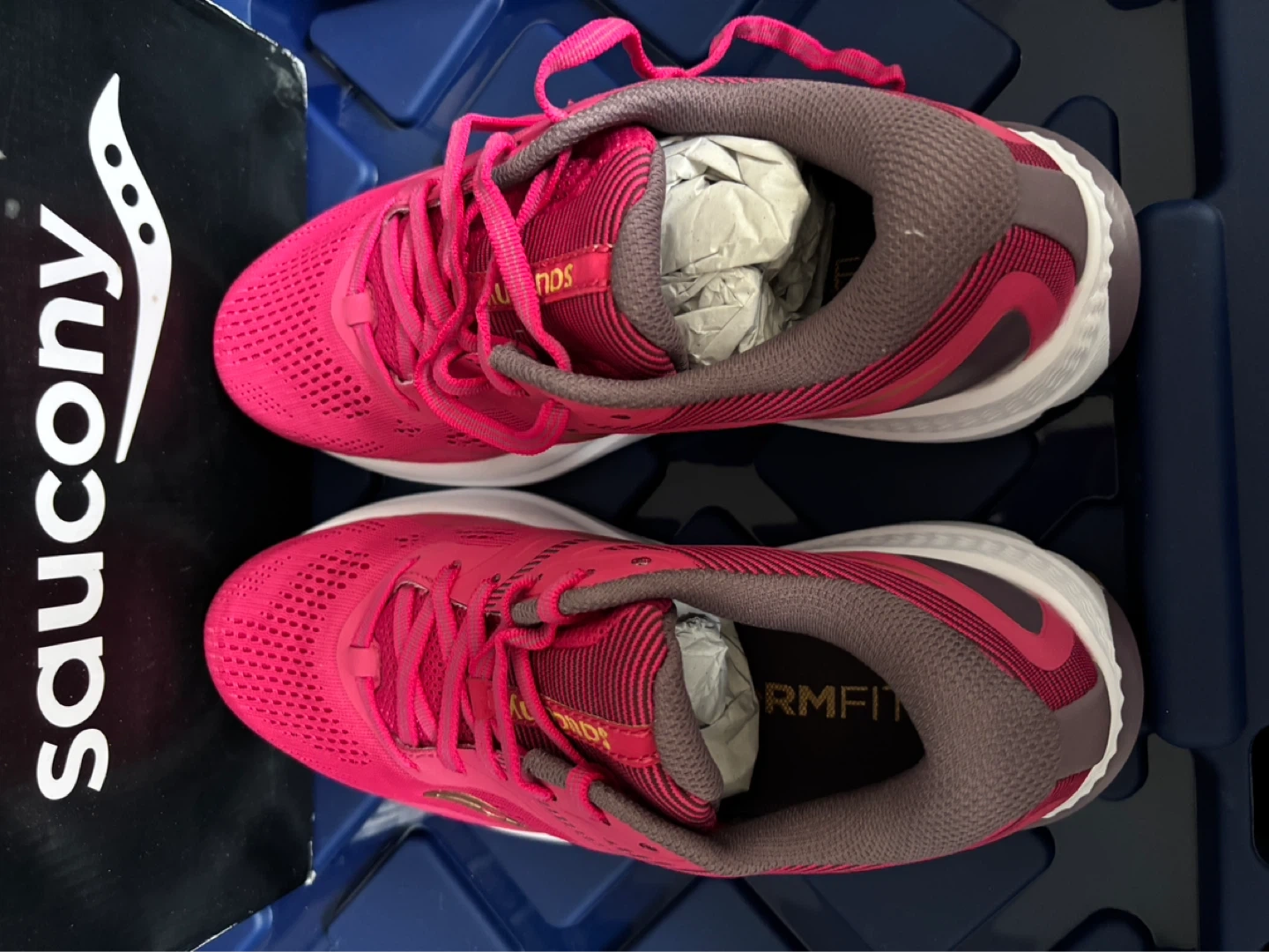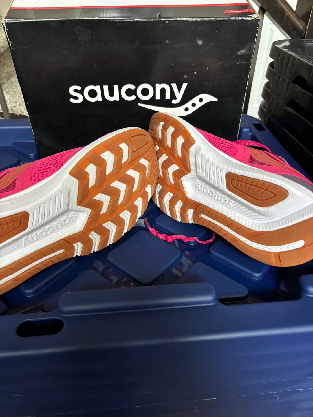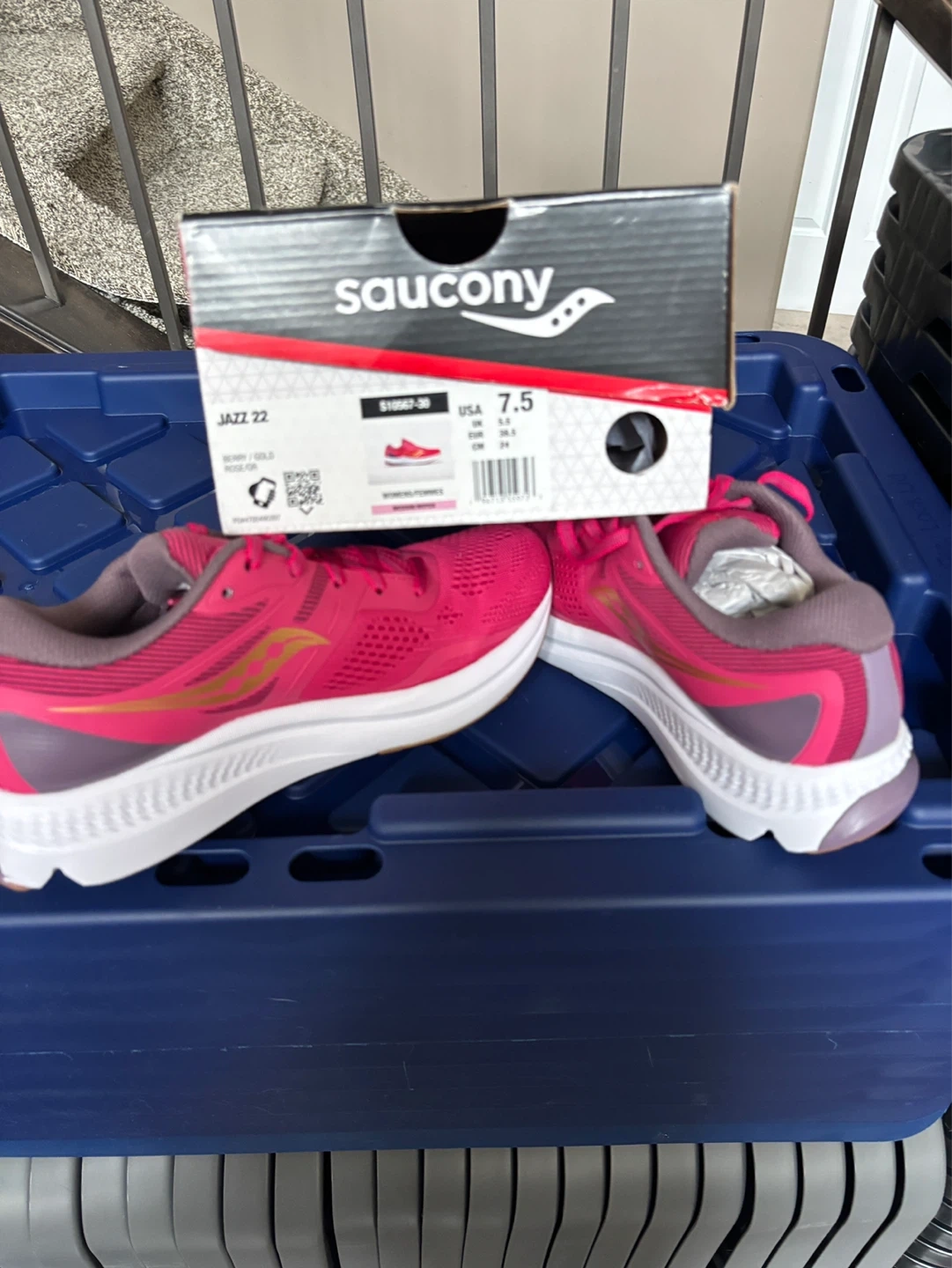 These pink and maroon Saucony Jazz 22 running shoes are a women's size 7.5. They come with the original box.