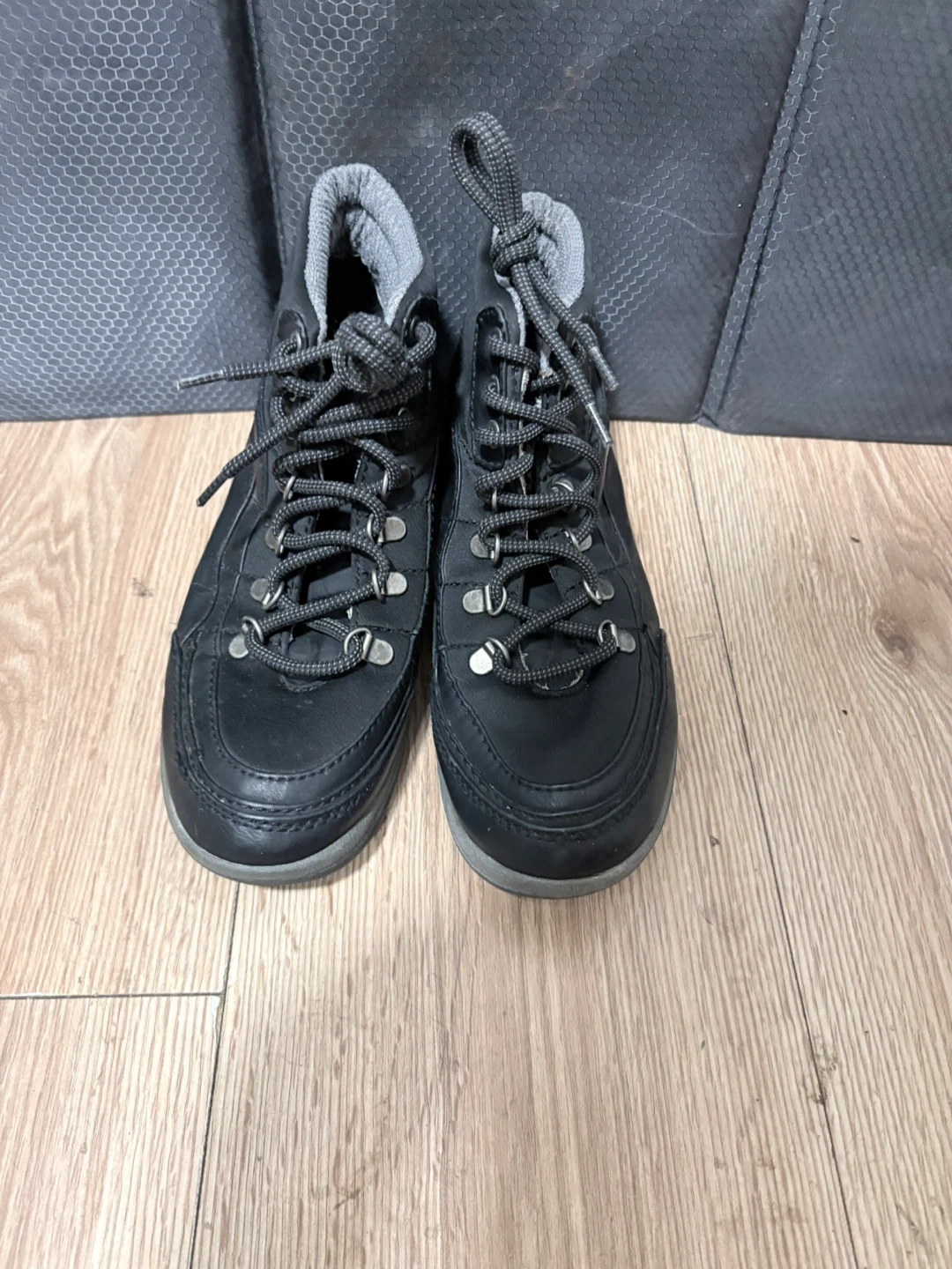 These black hiking boots feature a durable design with laces for a secure fit. They're made with a synthetic upper and rubber sole. Perfect for hitting the trails!