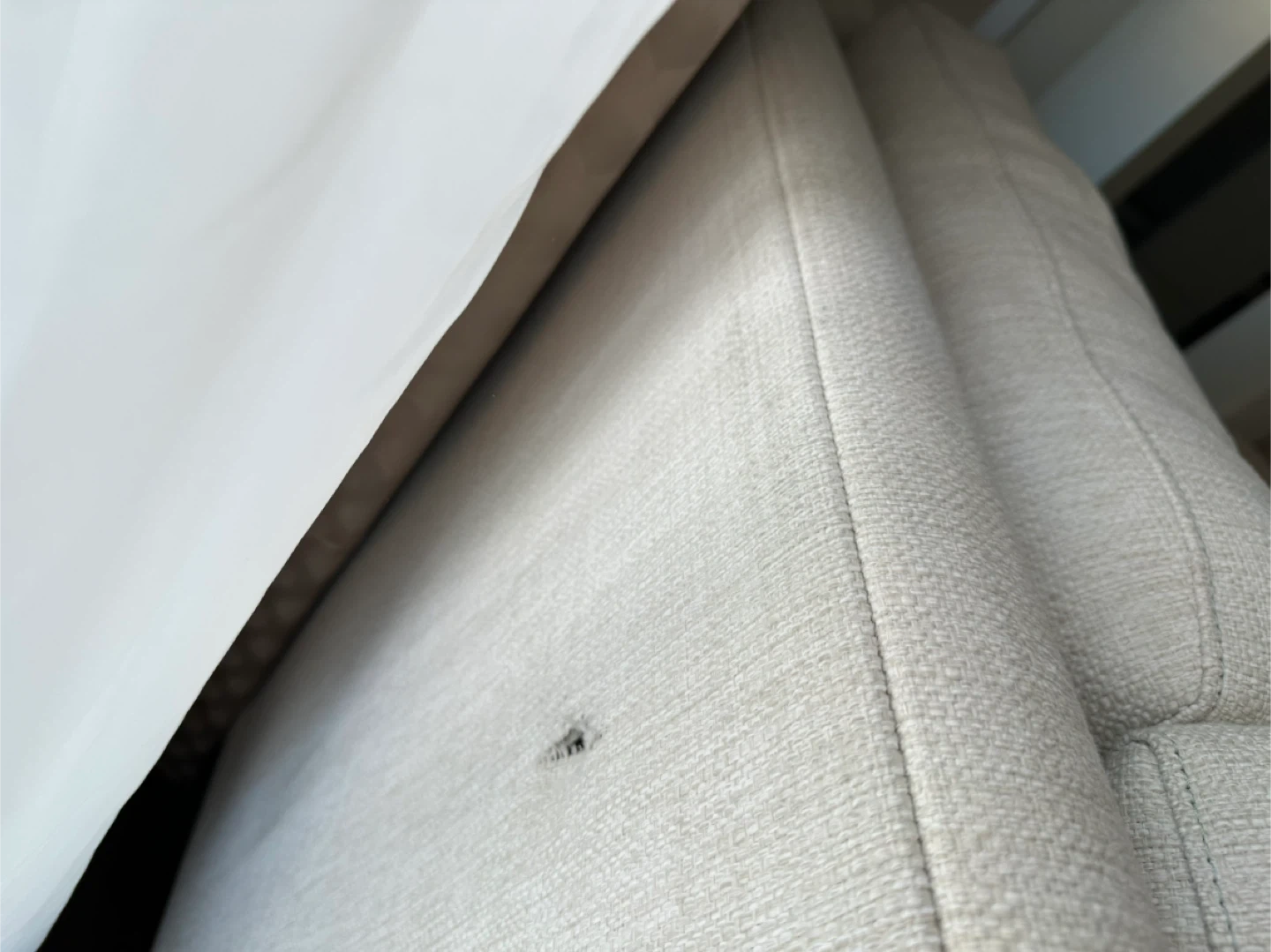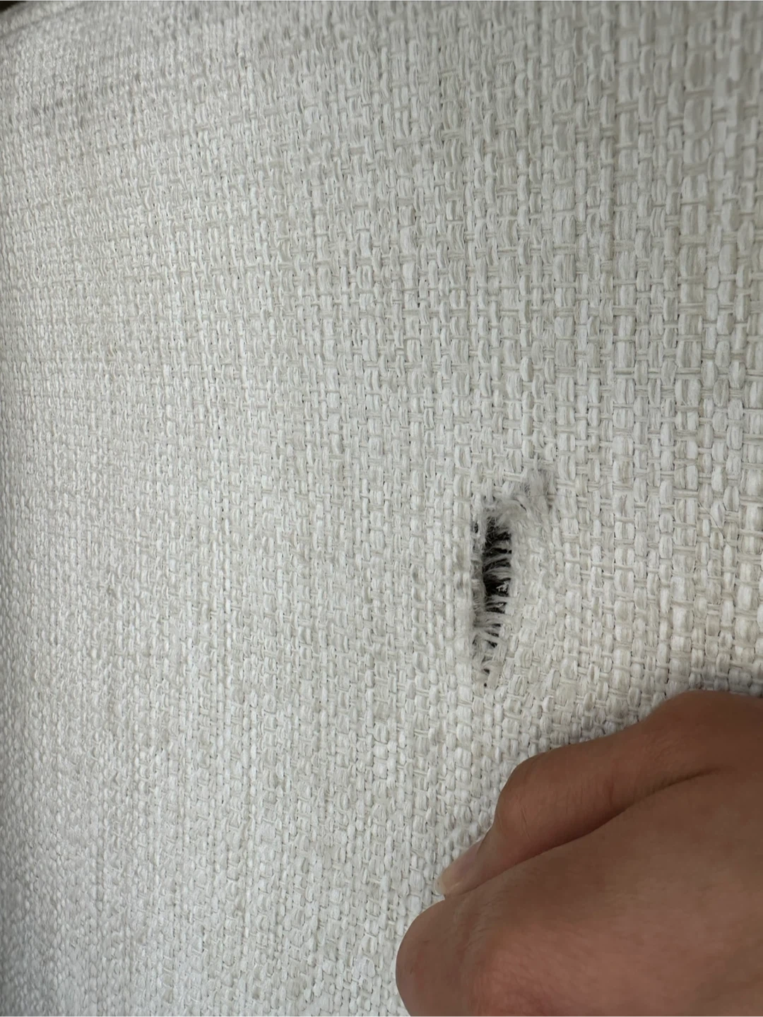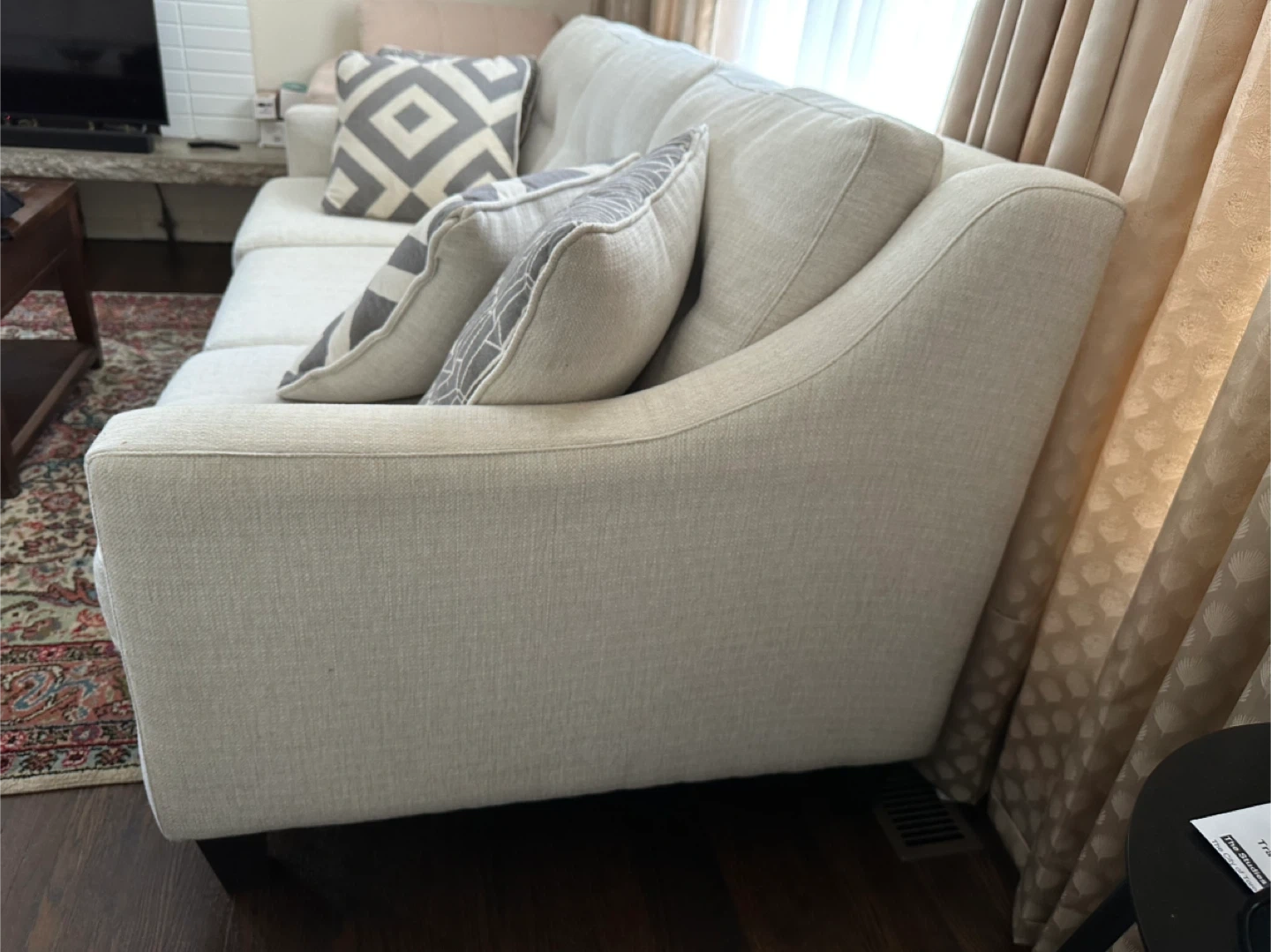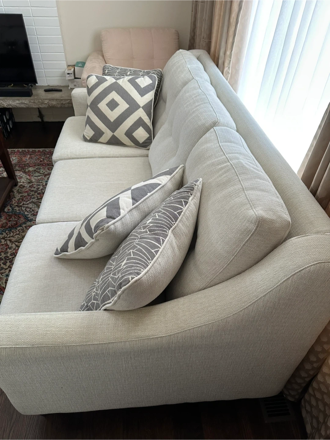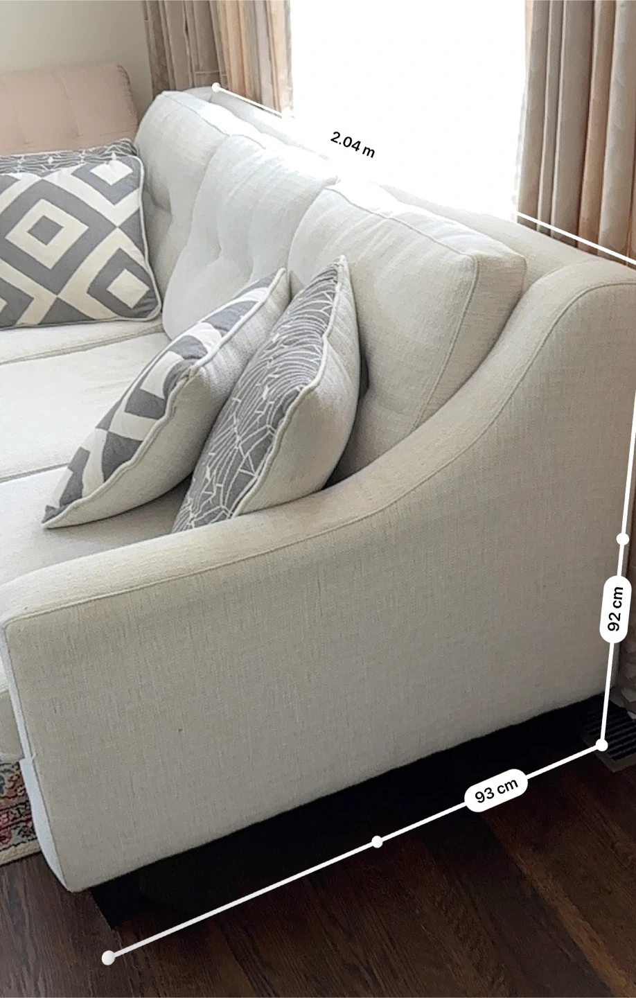 This light beige 3 seater sofa features a textured fabric. It measures 2.04m in length, 93cm in depth, and 92cm in height. Includes decorative pillows. Note: there is a small tear on the side.