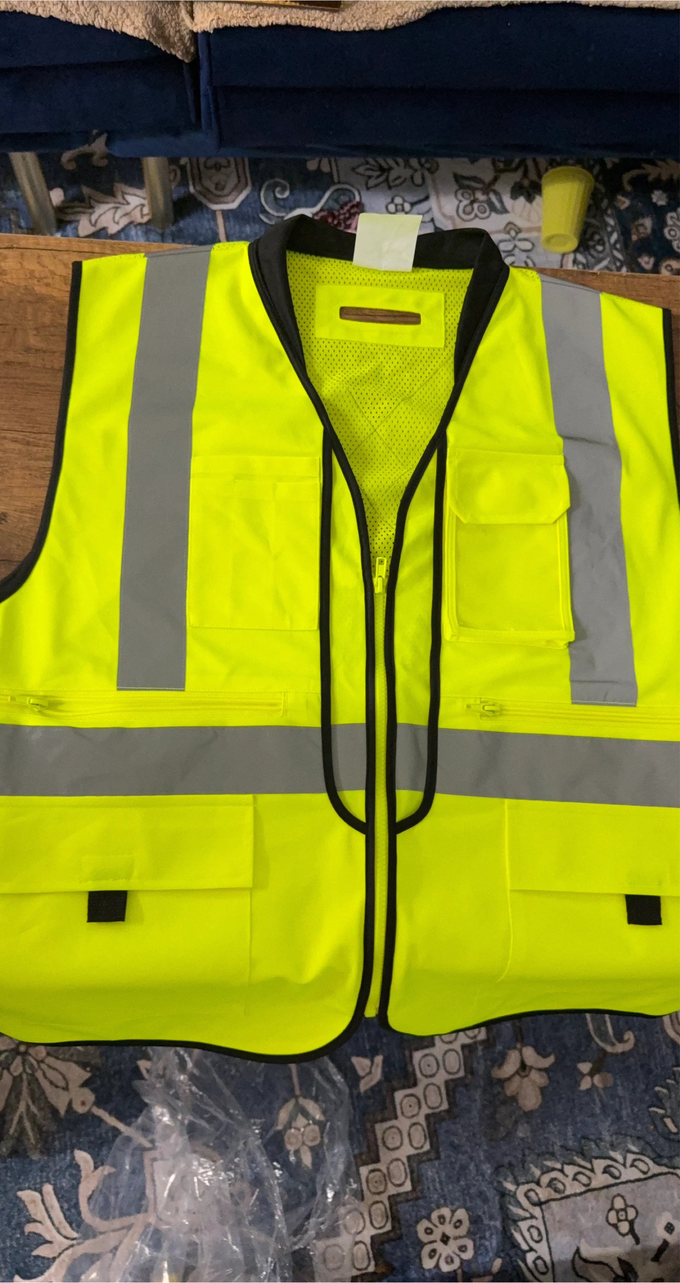 This is a high-visibility safety vest in bright yellow with reflective strips. It's a sleeveless garment designed for increased visibility. It features multiple pockets with zippers and flaps.
