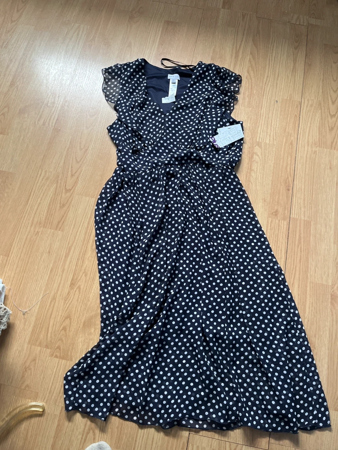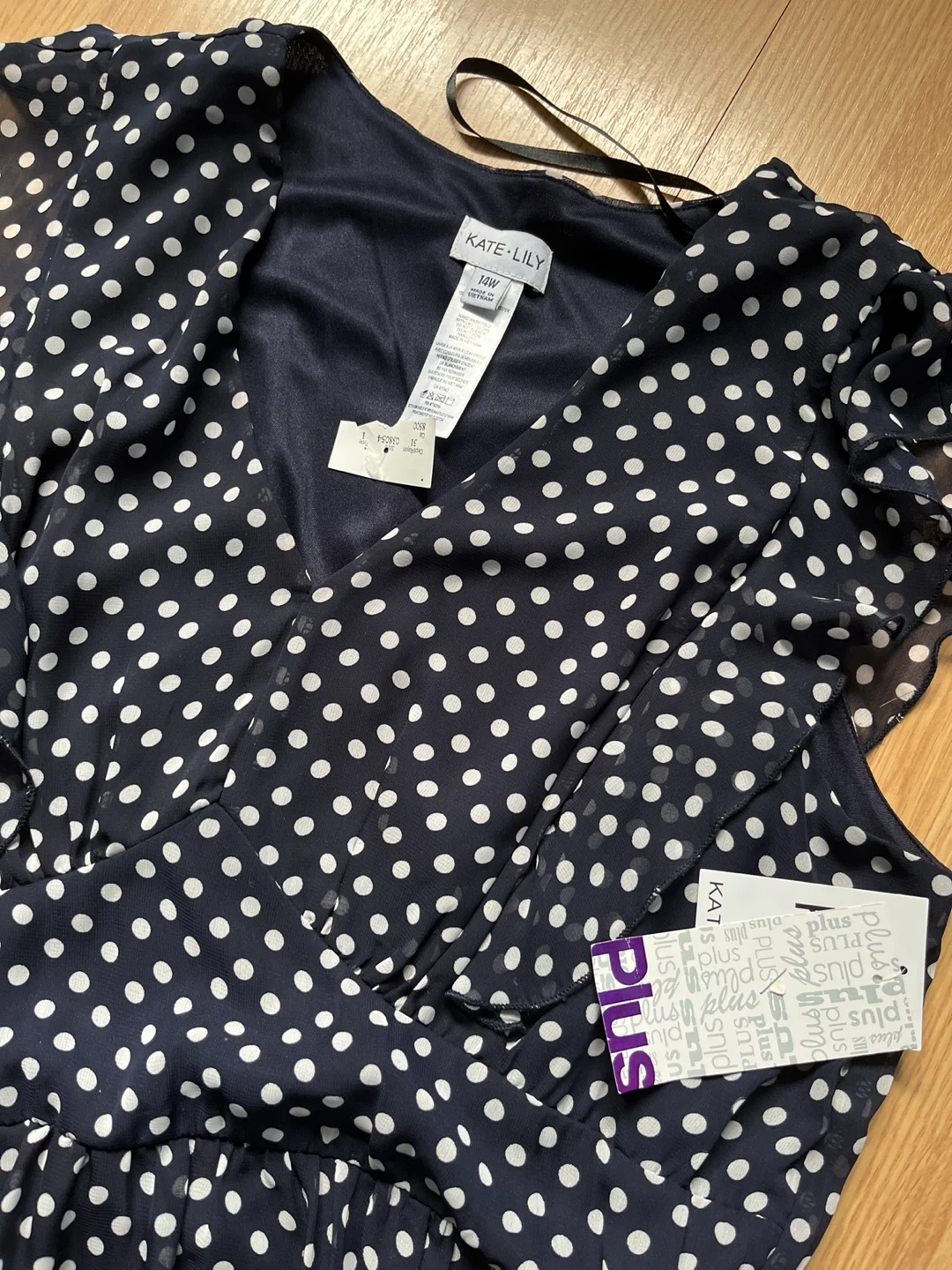 Navy and white polka dot maxi dress from Kate & Lily. It's a size 14W with ruffled short sleeves and a flattering V-neck. This dress features a flowy chiffon overlay and a comfortable elastic waistband.