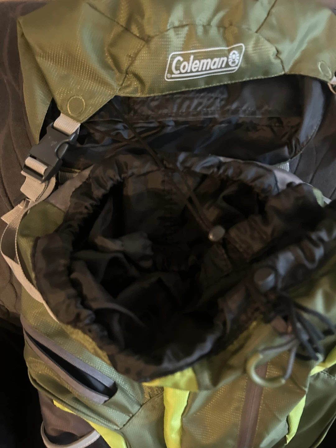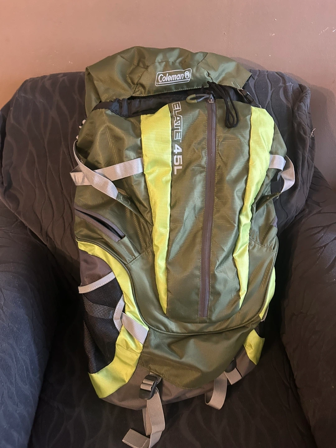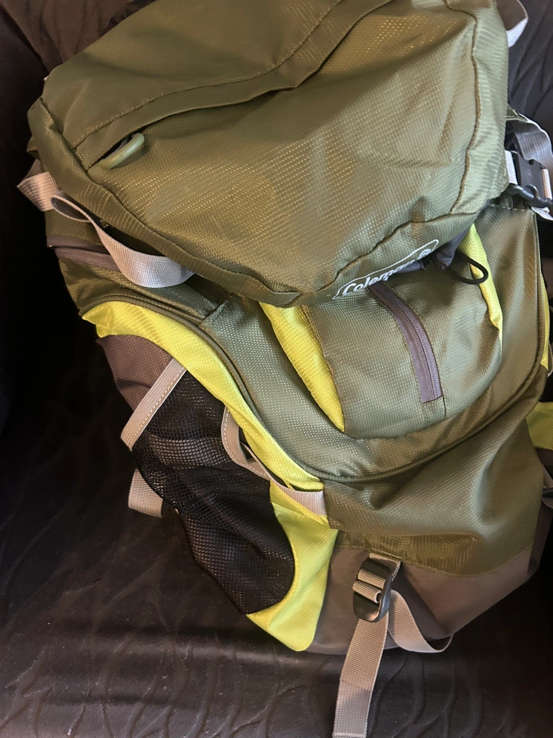 This is a Coleman Elite camping bag in olive green and neon yellow. It features multiple straps and a padded back for comfort. It's great for hiking or travel!Its brand new price is firm.
