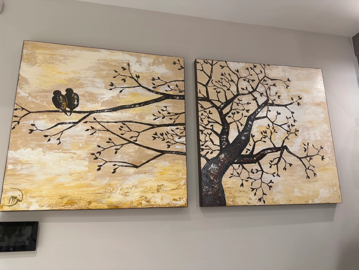 Beautiful diptych featuring two matching beige and brown canvas prints. One depicts a tree with birds perched on a branch, the other a detailed tree trunk and branches. Modern and stylish wall decor.