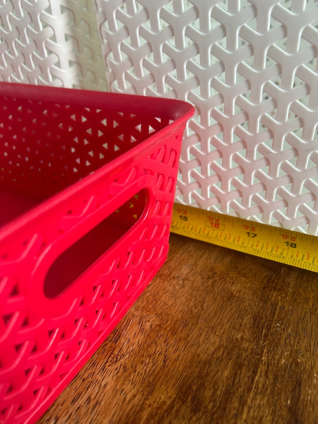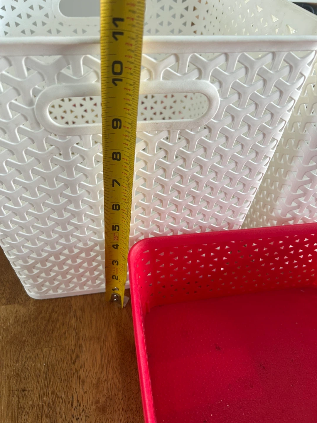 Two white and one red plastic storage baskets. The white baskets measure approximately 10 inches tall and the red basket is approximately 5 inches tall. They're great for organizing toys, crafts, or household items!