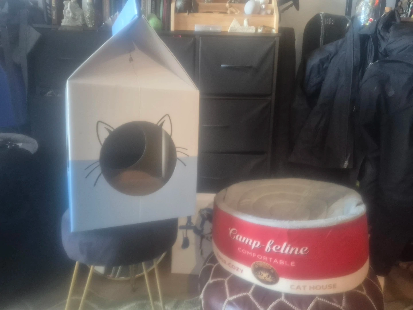Camp-Feline "Milk Carton" Cat House and Campbell's pet bed