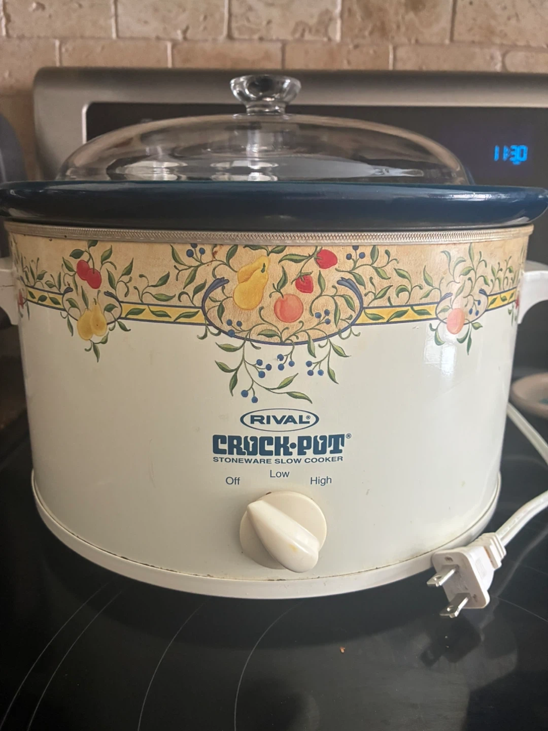 This is a Rival Crock-Pot stoneware slow cooker. It has three settings: Off, Low, and High. It's a great appliance for making stews or roasts.