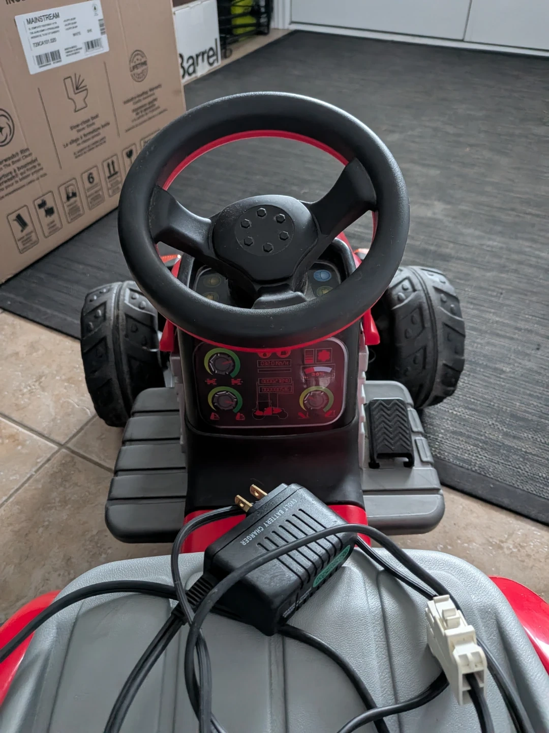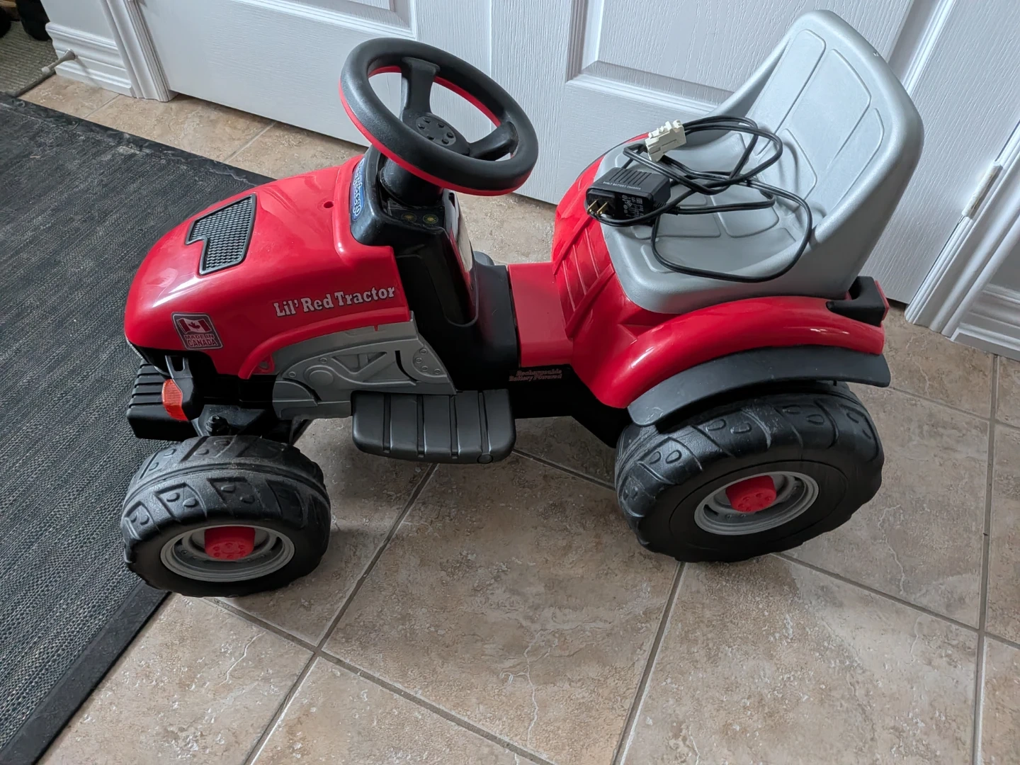 This is a Peg-Pérego Lil' Red Tractor ride-on toy, perfect for outdoor fun. It includes a battery charger for easy recharging. Its sturdy design and fun styling make it a great choice for young farmers!