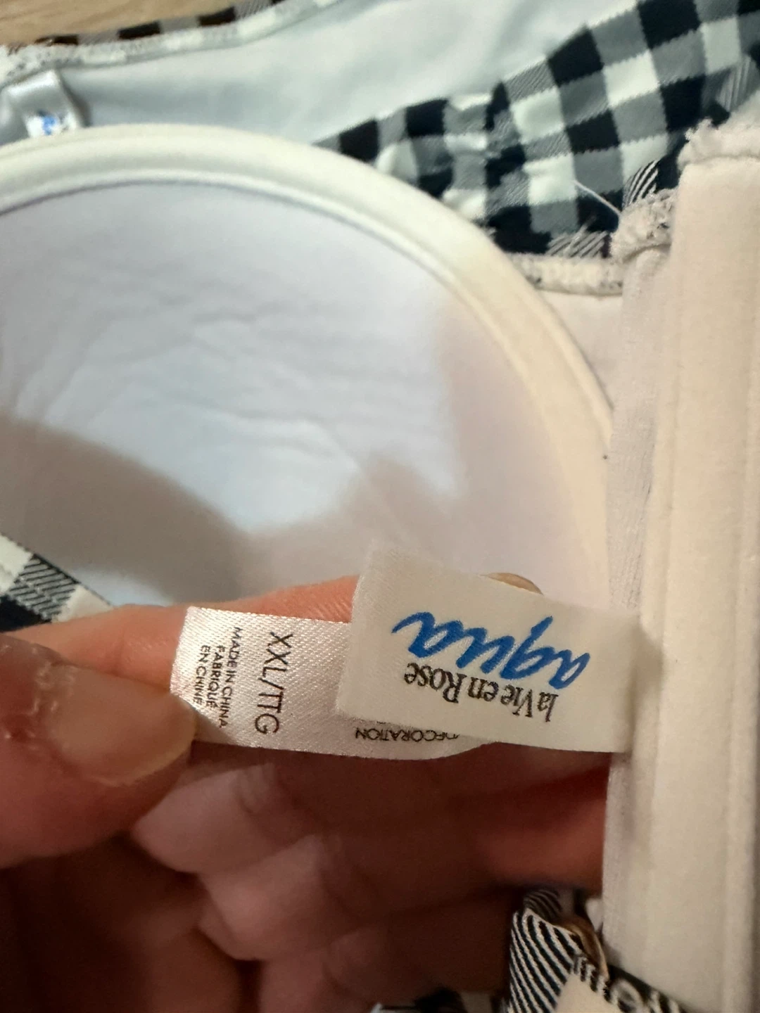 This La Vie en Rose Aqua bikini set features a classic black and white gingham pattern. It's a strapless bikini top with a ruched high-waisted bottom. Size is XXL top,XL bottom,very good condition