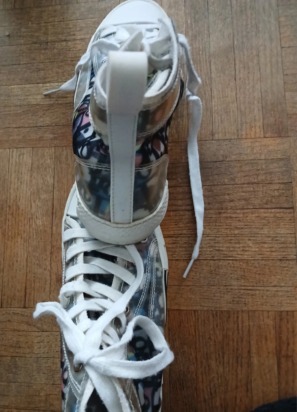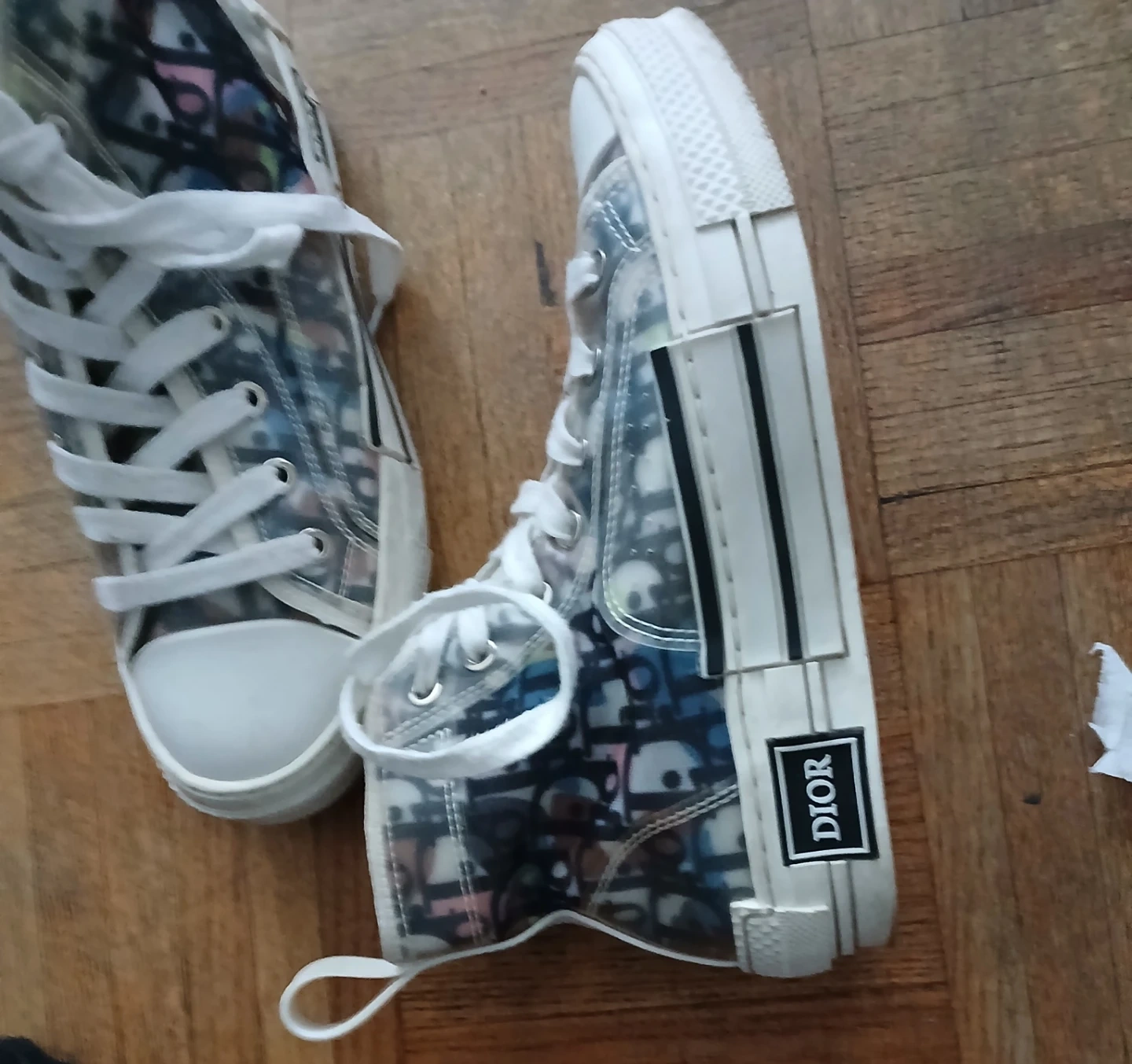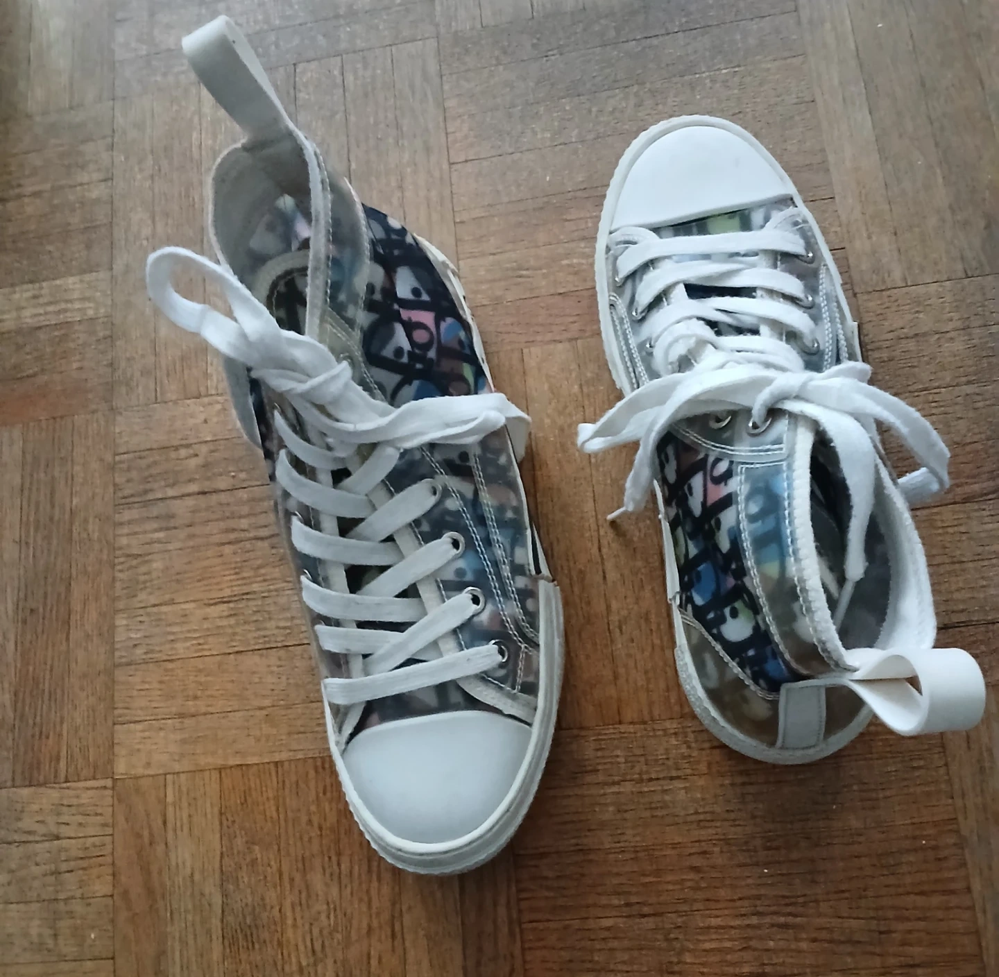 DIOR B23 high-top sneakers in size 37. Made in Italy. These stylish sneakers feature the iconic DIOR all-over monogram print with a clear overlay. They're perfect for adding a touch of luxury to any casual outfit!these sell for $500 new