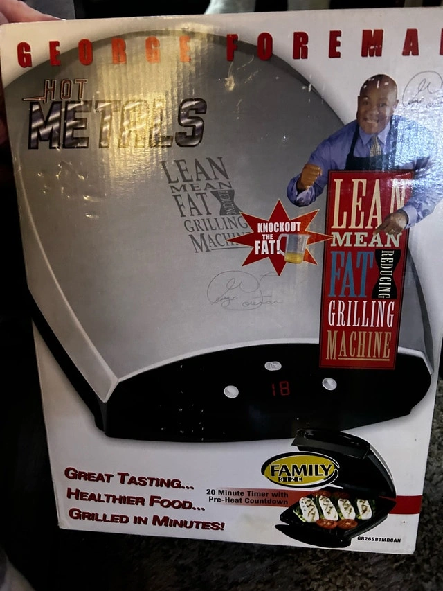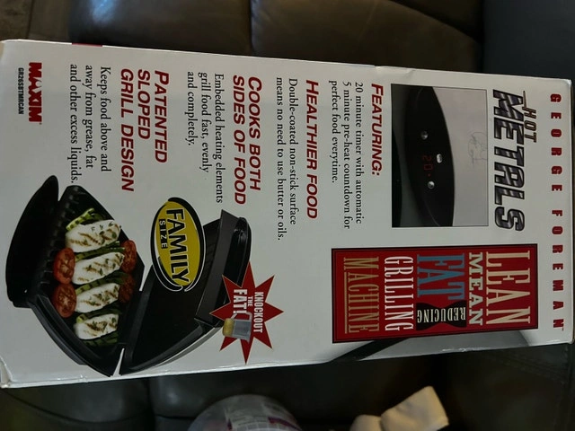 I'm offering a like-new George Foreman Grill, perfect for quick and healthy meals. This grill features a 20-minute timer with pre-heat countdown, ensuring your food is grilled to perfection every time. The double-coated non-stick surface means no need for butter or oils, making for healthier cooking. Additional features include: Patented Sloped Grill Design, Embedded heating elements grill food fast, evenly, and completely, and it cooks both sides of the food. This grill is in excellent condition and comes in its original packaging. A new George Foreman grill will set you back around $100, but this one can be yours for a steal!