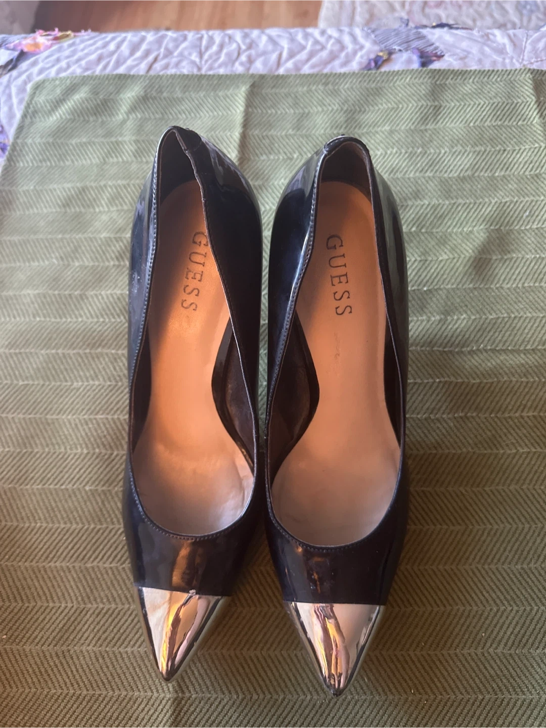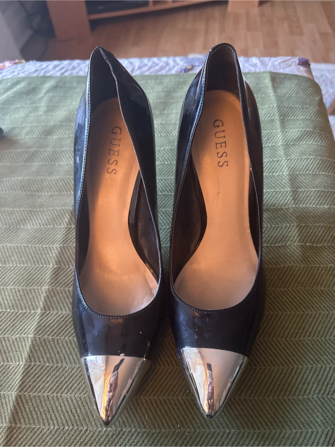 Classic black patent leather heels from Guess, featuring a striking silver metallic toe cap. These pumps have a pointed toe and a stiletto heel. They're stylish and versatile for many occasions.