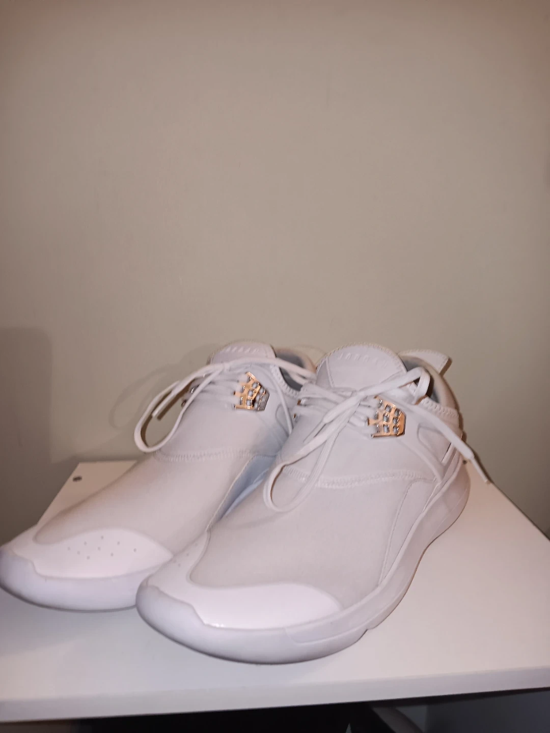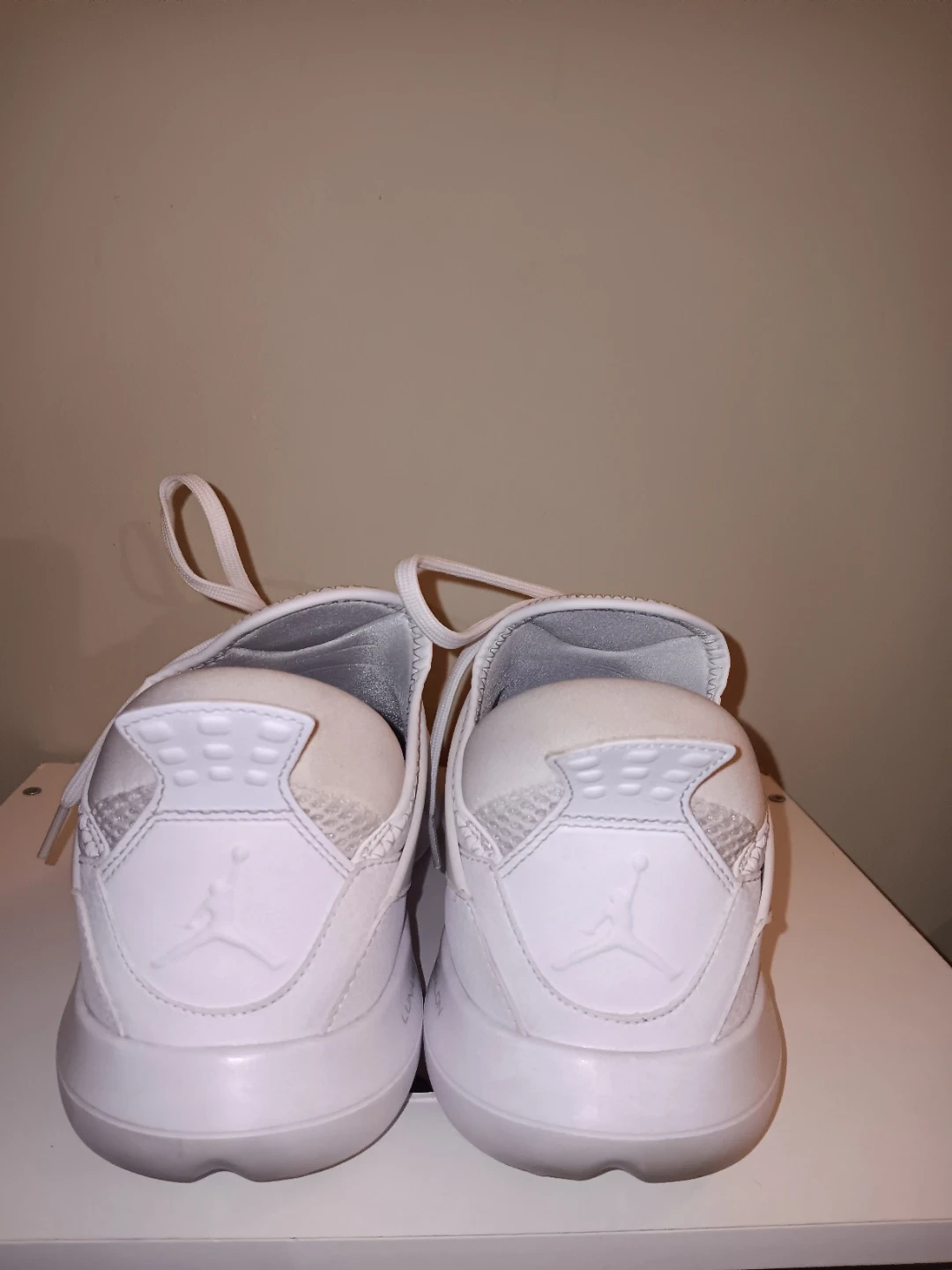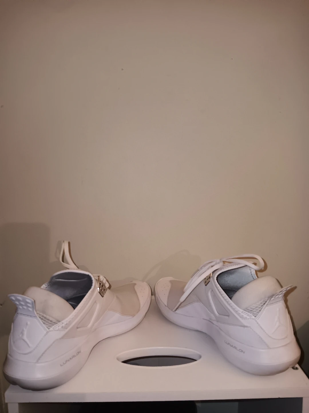 White Jordan Lunarlon. Th feature a clean white design with the iconic Jordan Jumpman logo. Lunar technology provides cushioning.