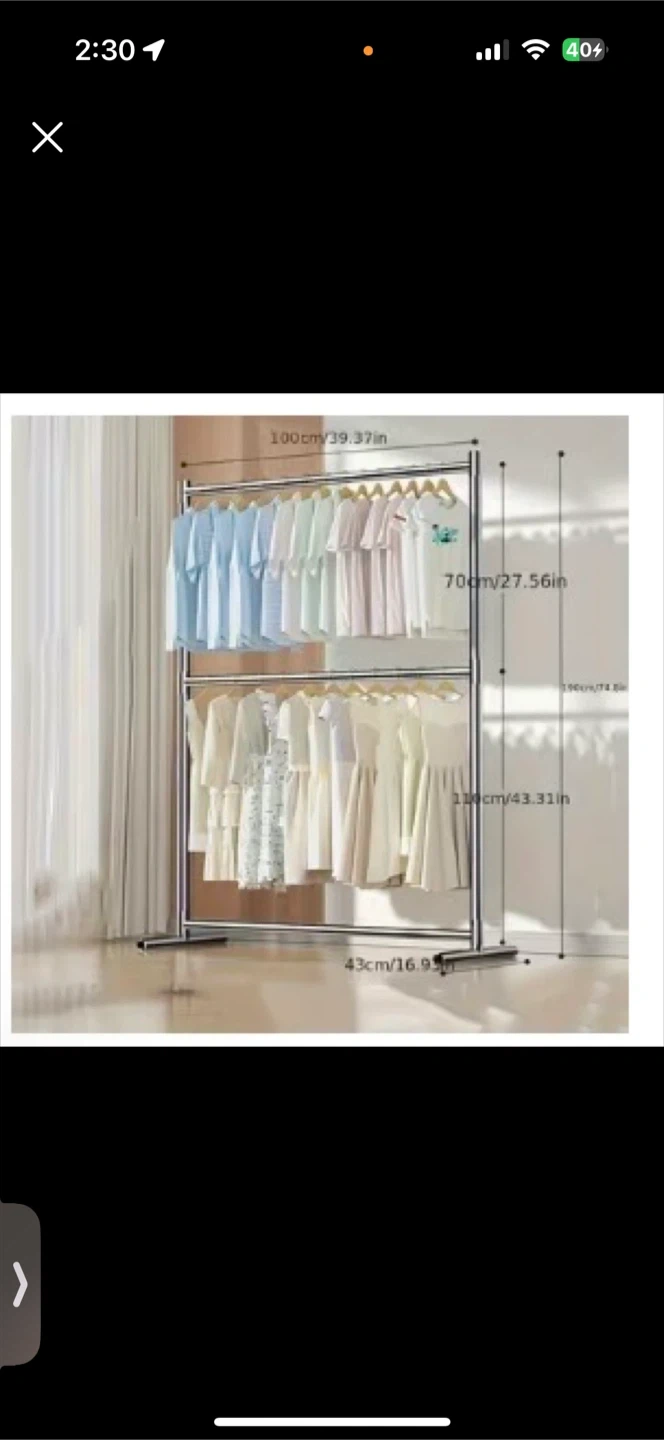 Este perchero de doble nivel proporciona un amplio espacio para colgar la ropa. Está hecho de metal y mide 100 cm de ancho por 110 cm de alto. La profundidad es de 43 cm, y la barra superior es de 70 cm desde la parte inferior.