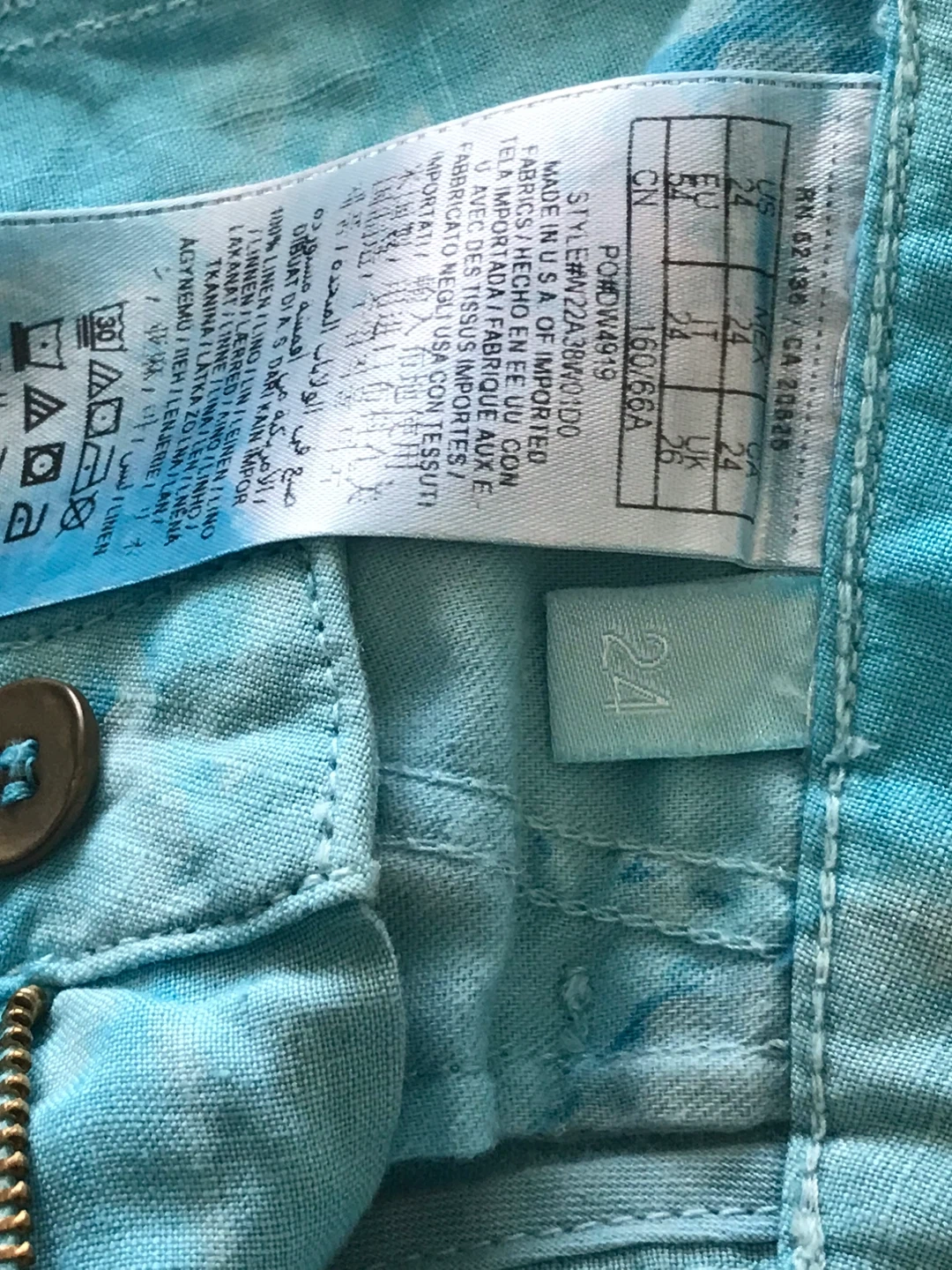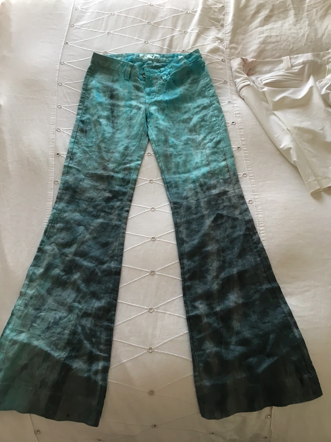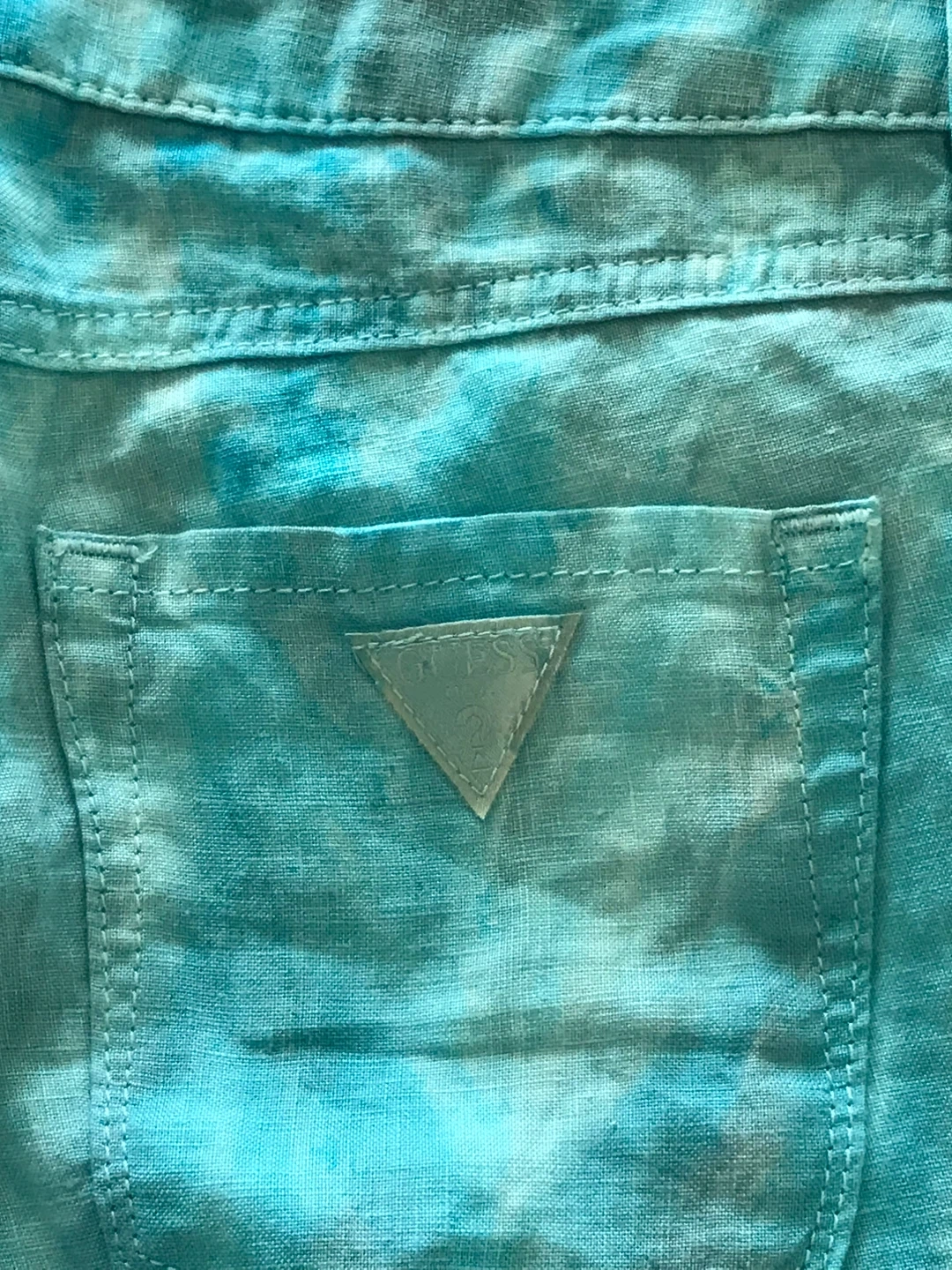 Cute Guess flare jeans in a unique blue and green tie dye pattern! They're a size 24 and made of linen and rayon, perfect for a breezy summer day