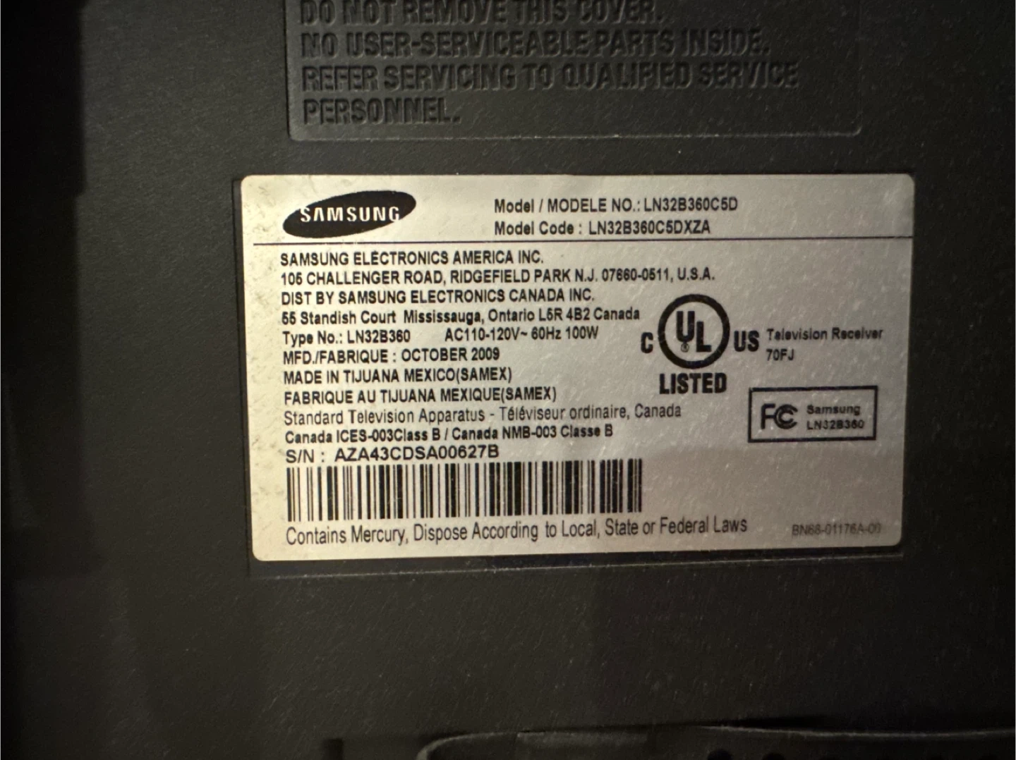 Samsung 32-inch LCD TV, model LN32B360C5D. Manufactured October 2009. It's a flat-screen television with a black bezel. Includes power cord.