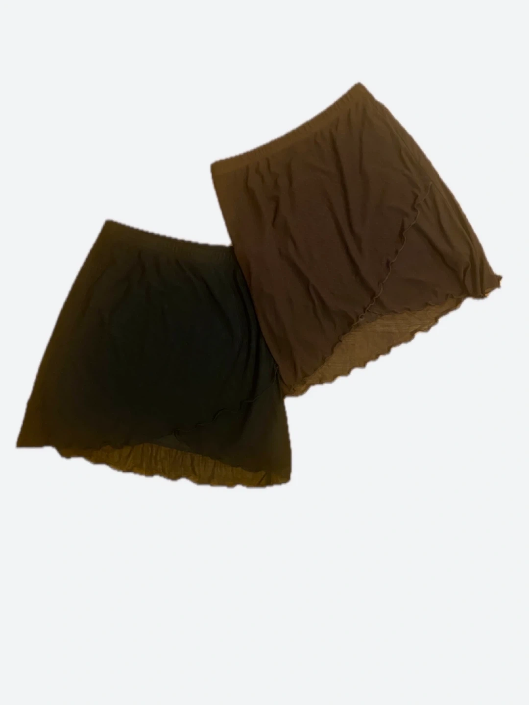 Selling two cute y2k skirts! One is a dark brown and the other is black. S-M elastic waistband..super comfy..lined with sheer overlay!