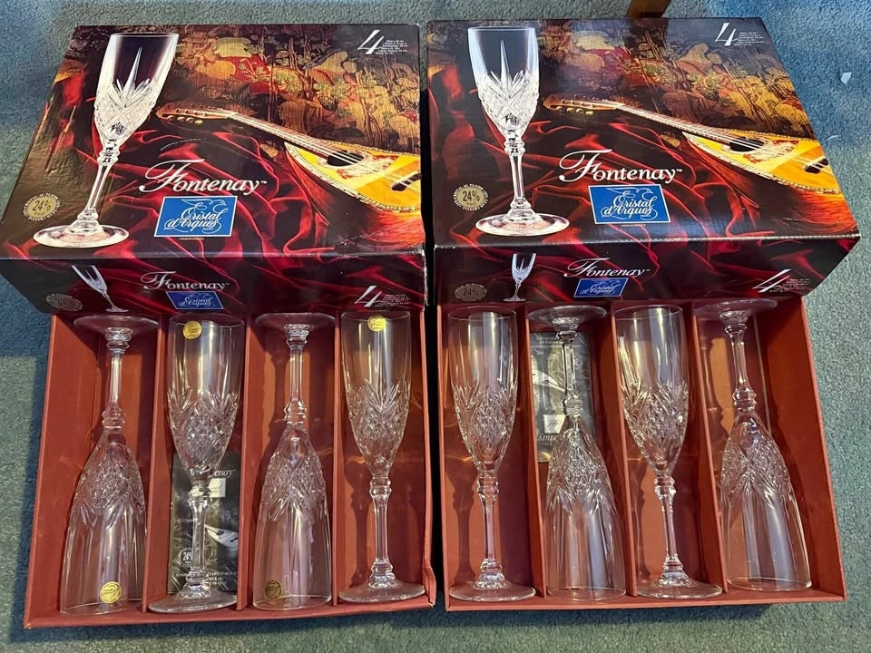 Cristal d'Arques Longchamp champagne flutes. The glasses feature a cut crystal design and are presented in their original "Fontenay Cristal d'Arques" branding boxes.