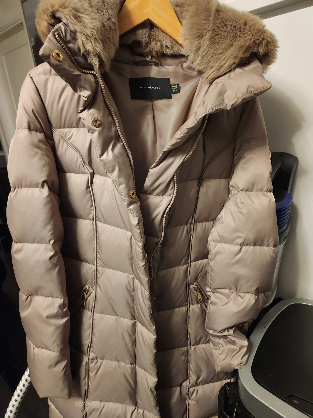 Here's a Tahari puffer coat, perfect for staying warm this winter! It's a women's size large and features a stylish faux fur hood. It's in great condition and ready for a new owner