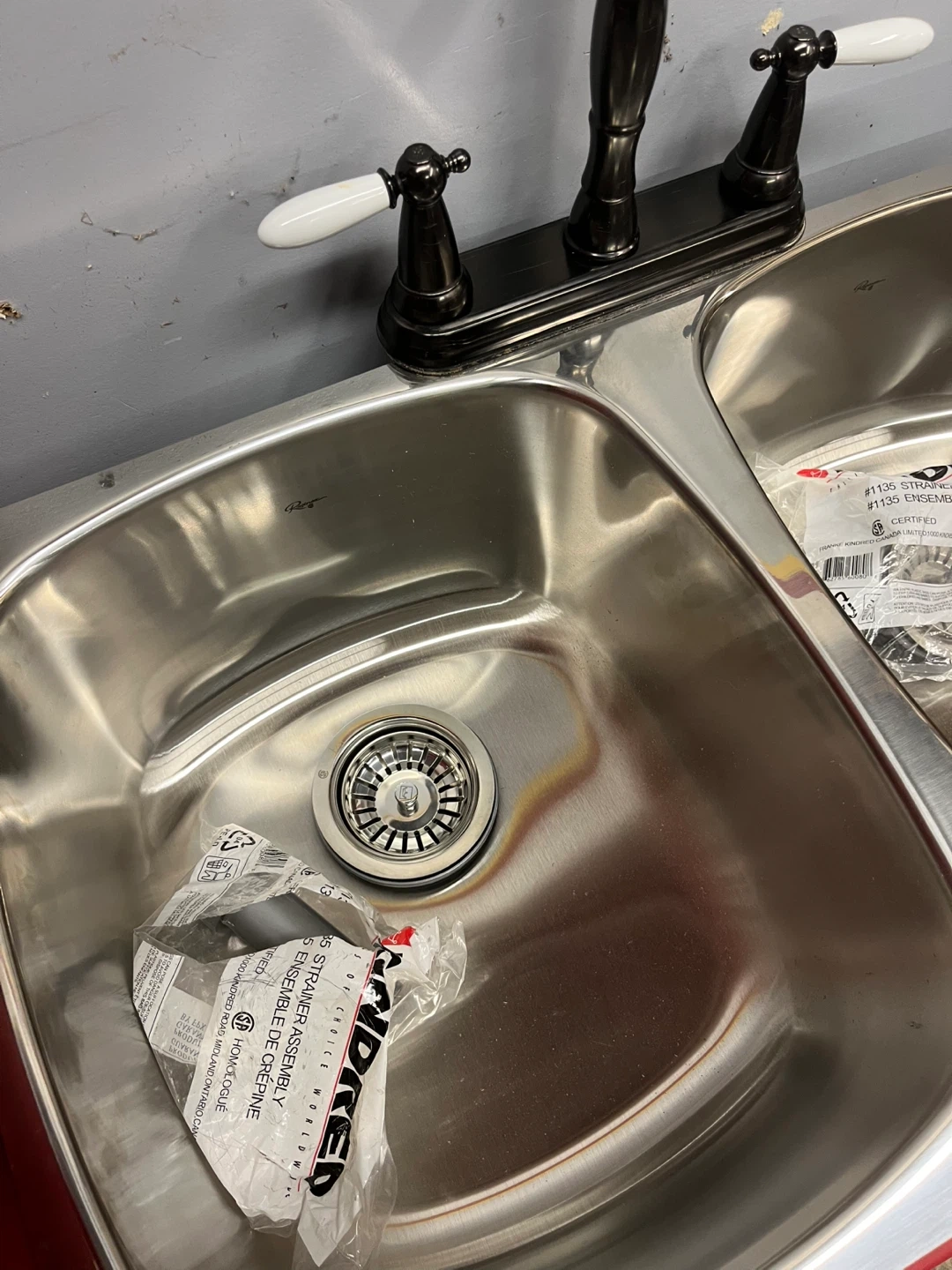 This is a new stainless steel double basin under mount kitchen sink with a black vintage style faucet and two strainers. Includes all necessary mounting hardware and drain assemblies.