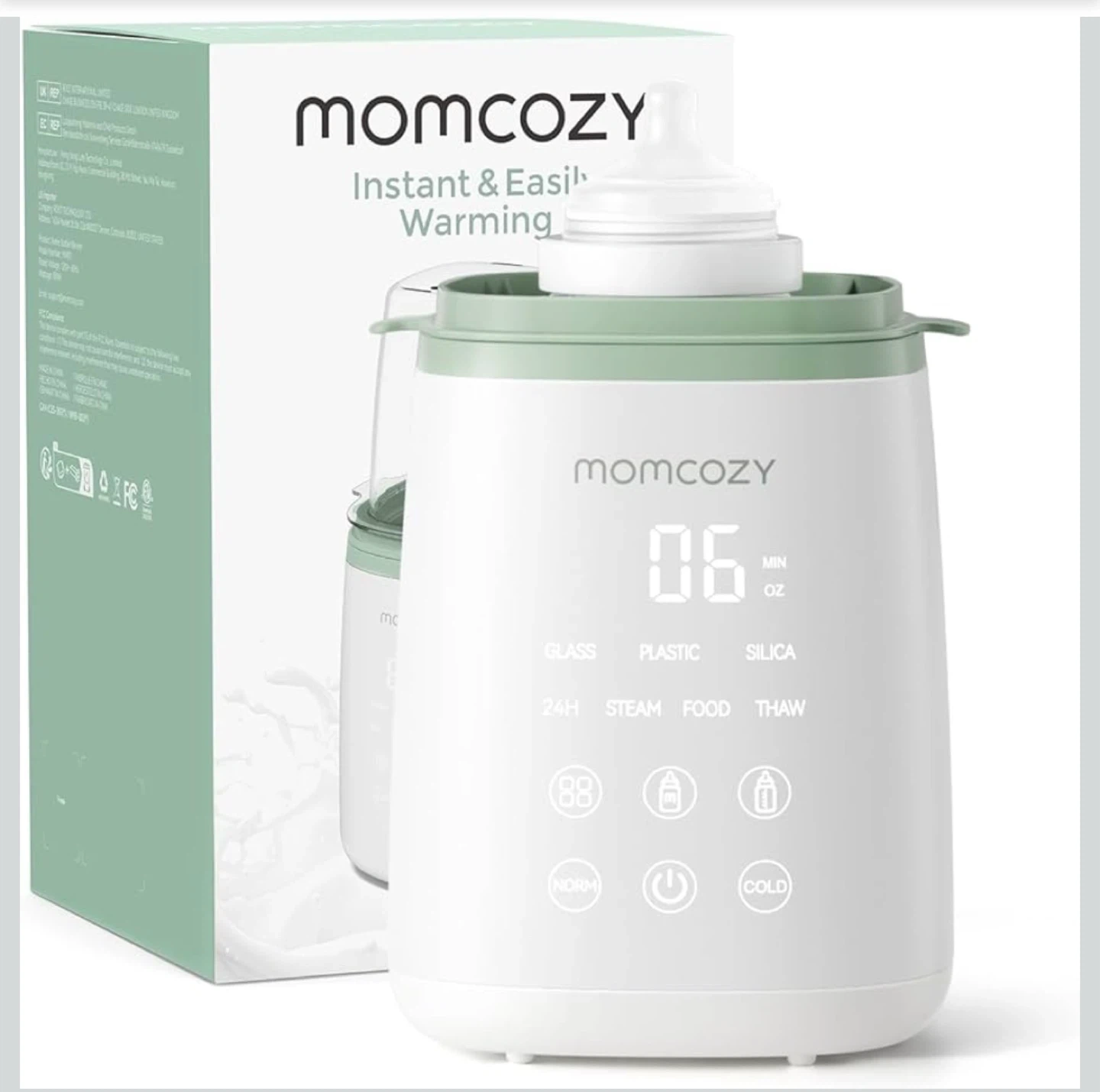 This is a Momcozy bottle warmer with steam and thaw functions. It has settings for glass, plastic, and silica materials. It also includes a 24-hour warming feature. This warmer is useful for quickly and safely preparing baby bottles.