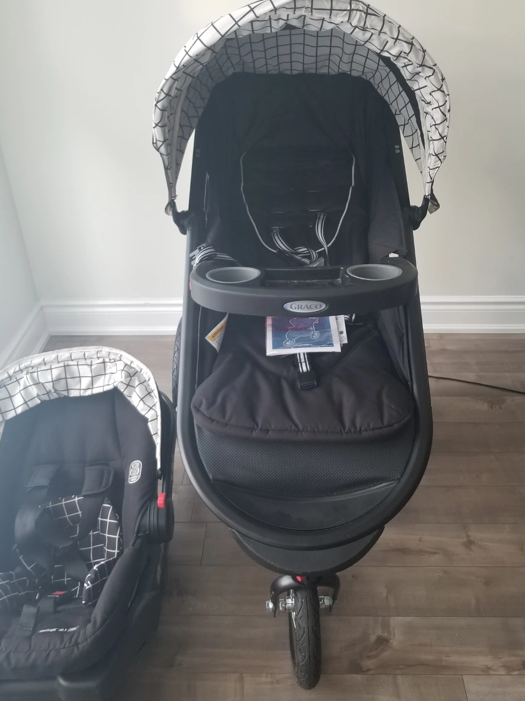 Graco jogging stroller and infant car seat. Black and white gingham pattern. Stroller features cup holders and large wheels. Car seat is compatible with the stroller. Includes instruction manuals.
