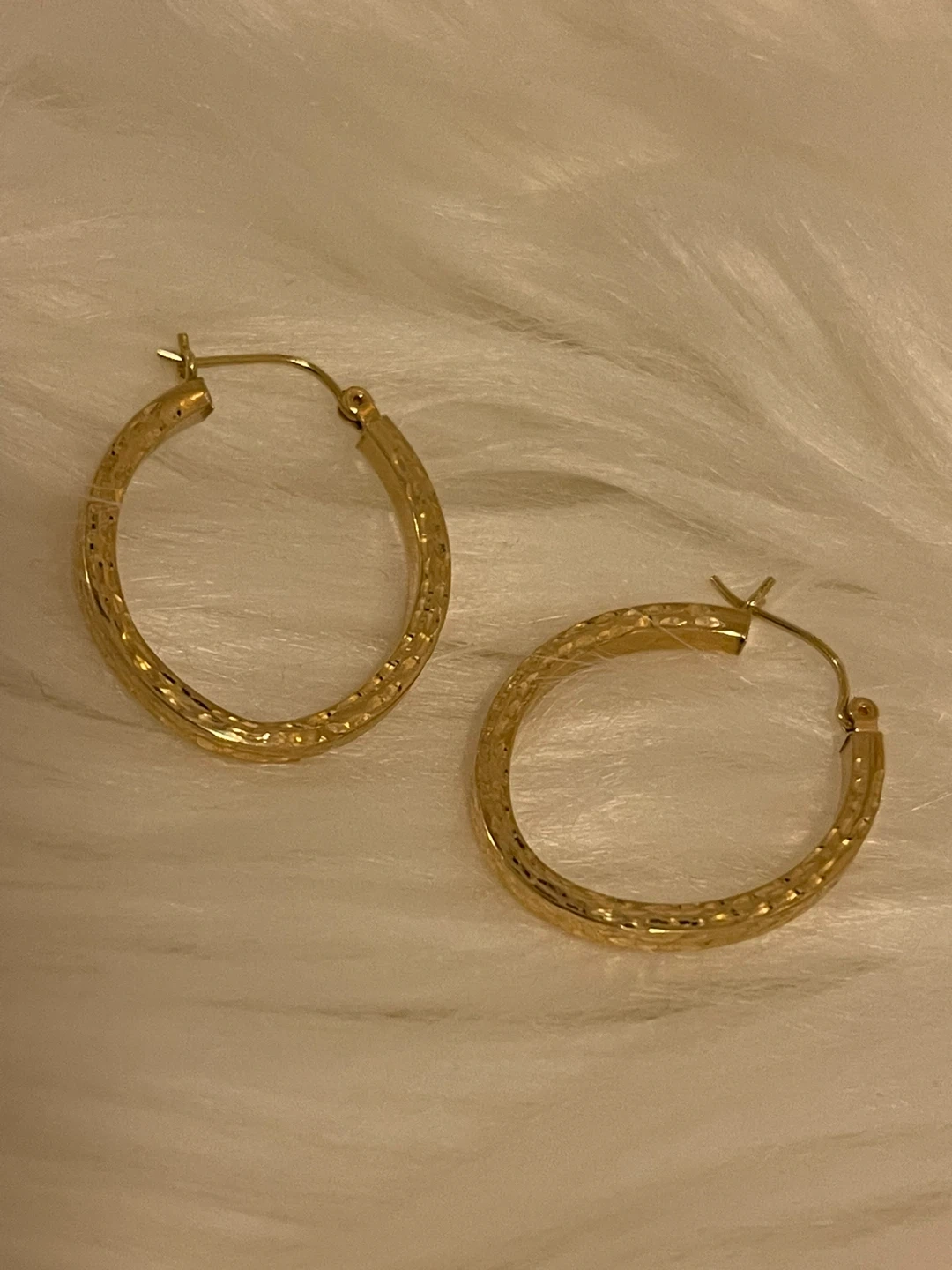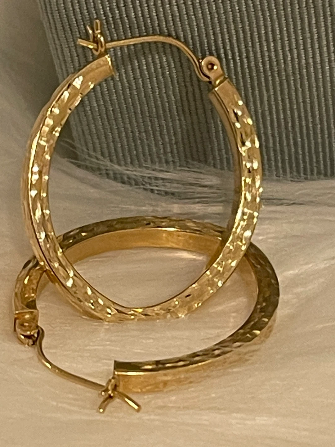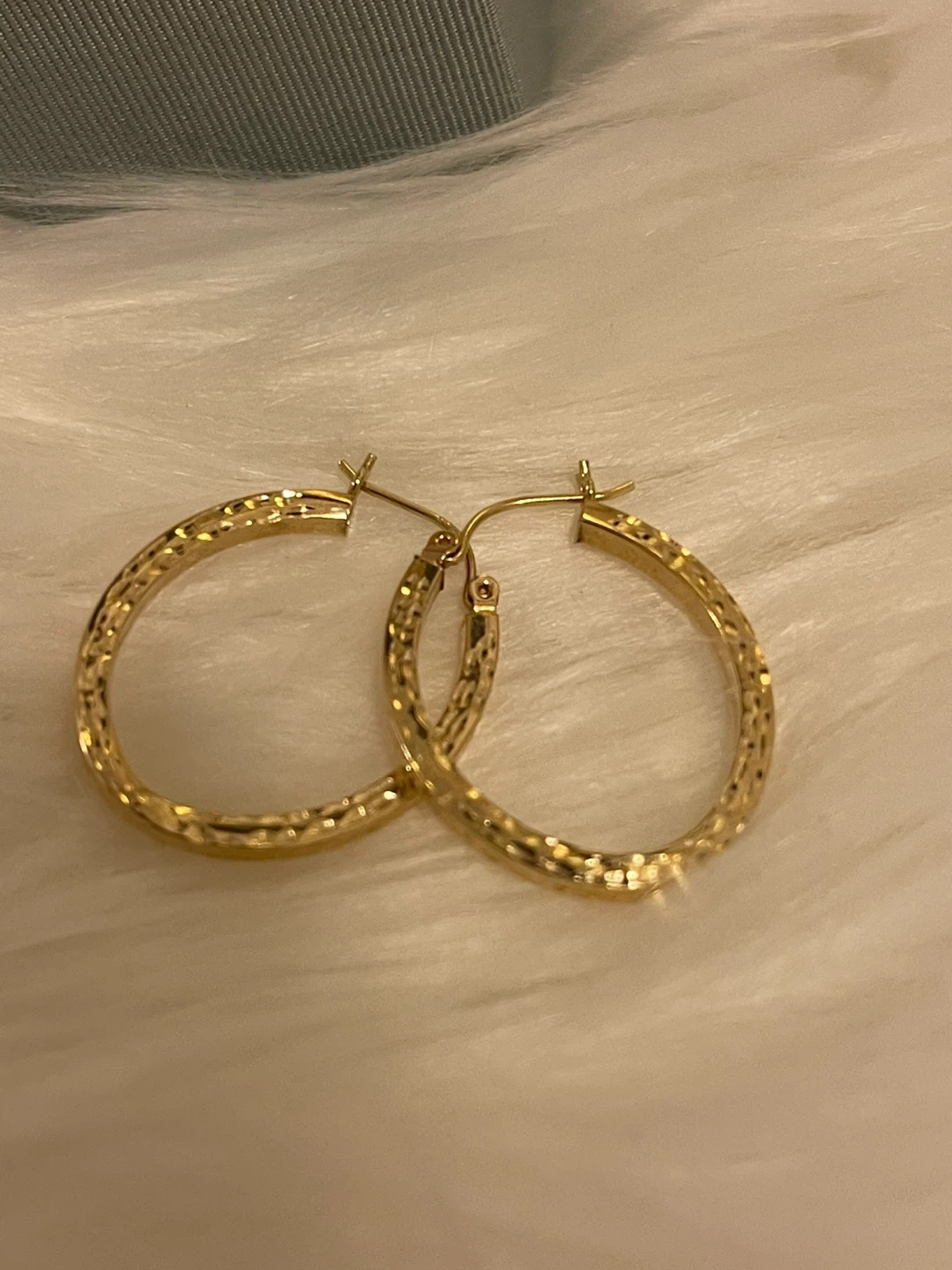 Pre-owned 14k Yellow Gold Diamond-Cut Hoop Earrings. This item is in excellent condition , it has just tiny dent on one but not noticeable . The distinctive textured appearance is achieved through diamond-cut techniques, allowing the gold to capture and reflect light from multiple angles, thereby enhancing its visual appeal. Selling on behalf of my Mom.