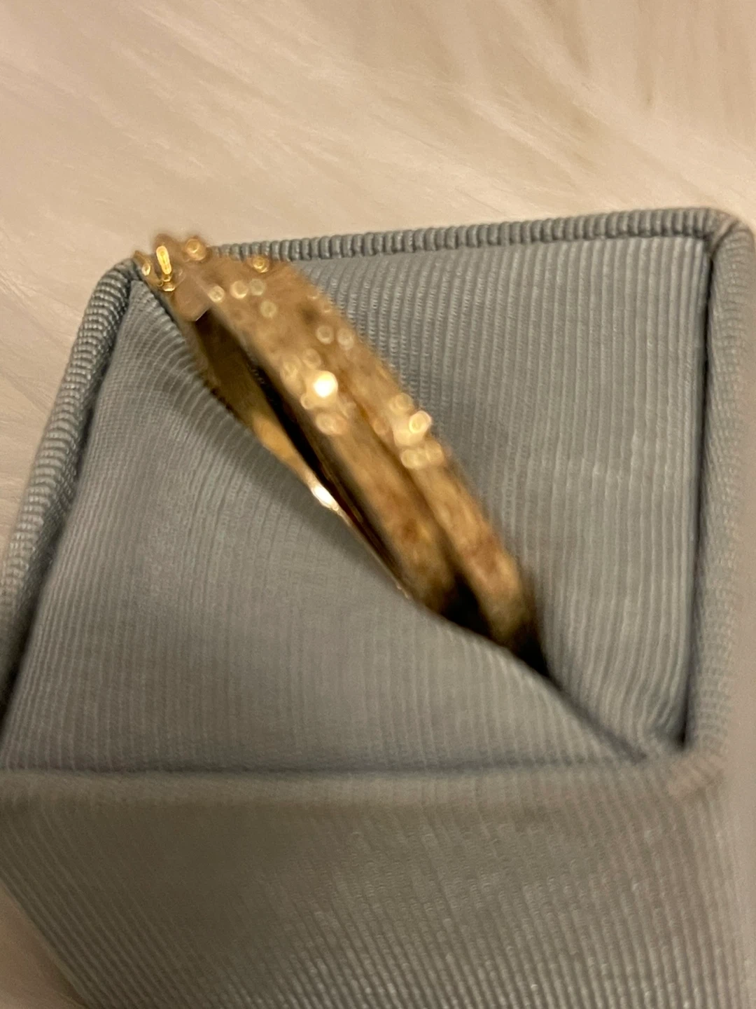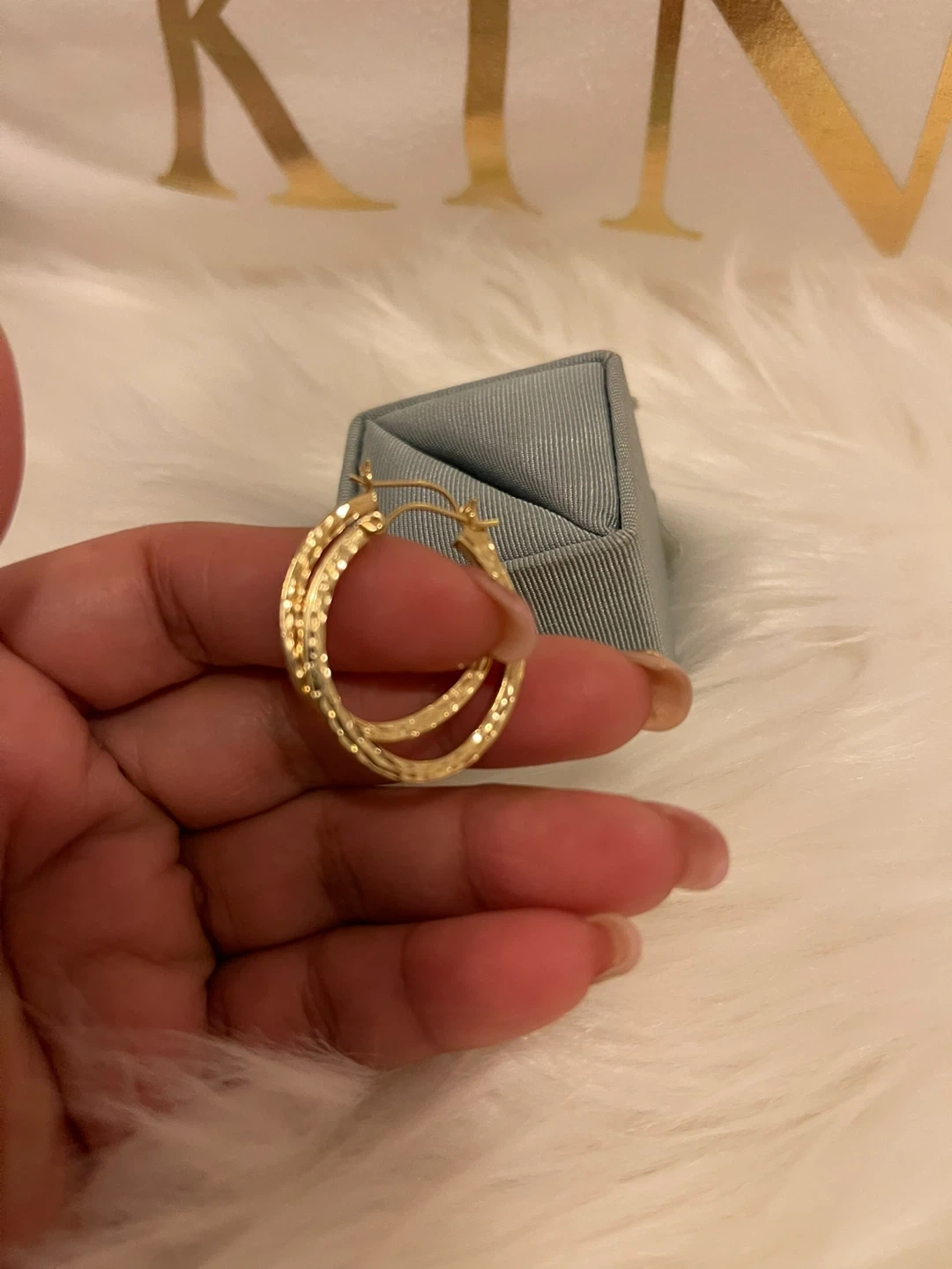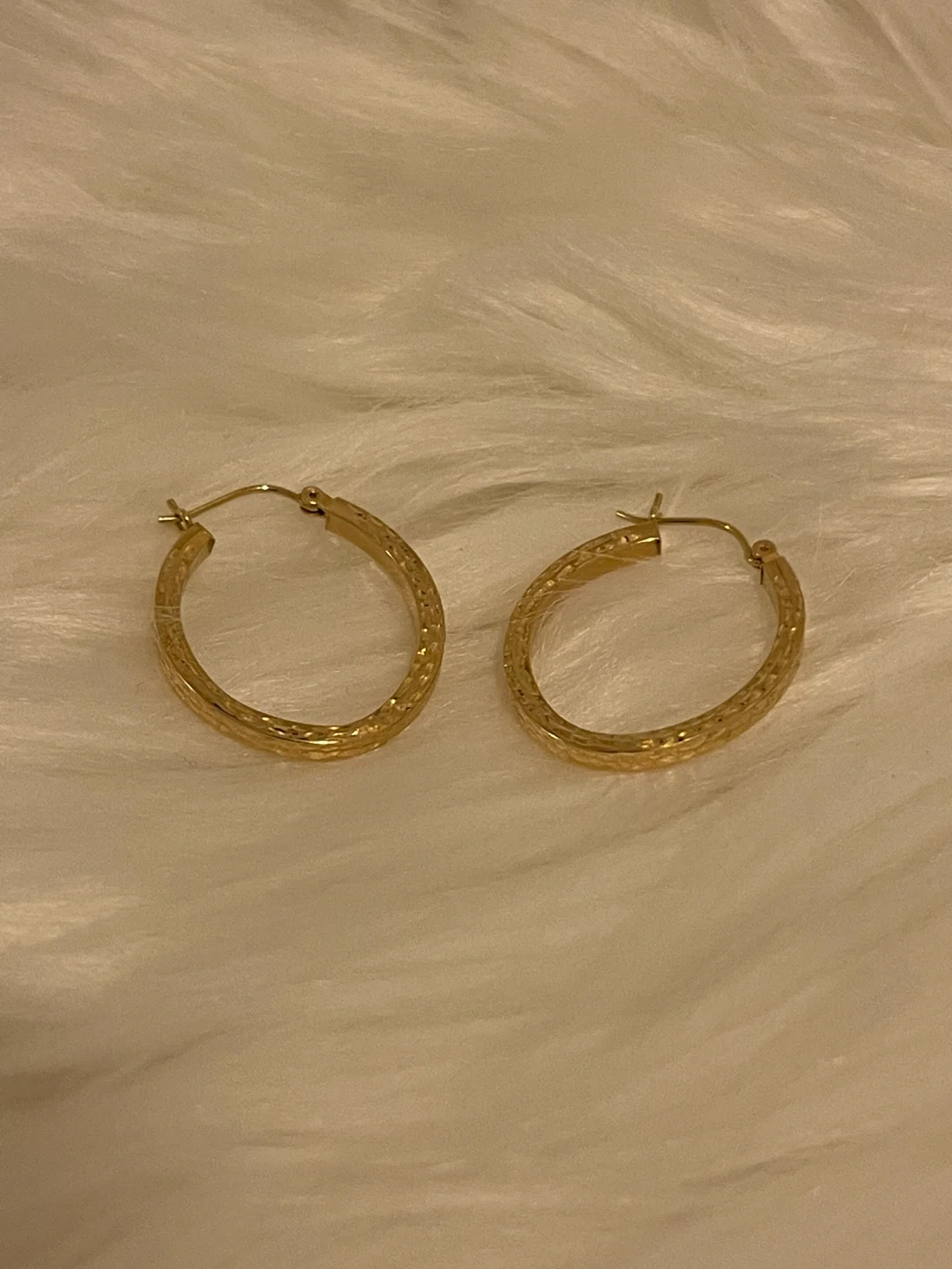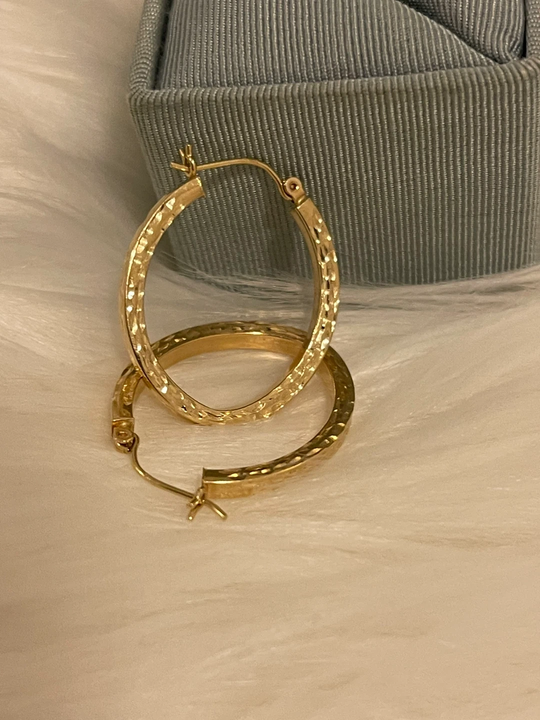 Pre-owned 14k Yellow Gold Diamond-Cut Hoop Earrings. This item is in excellent condition , it has just tiny dent on one but not noticeable . The distinctive textured appearance is achieved through diamond-cut techniques, allowing the gold to capture and reflect light from multiple angles, thereby enhancing its visual appeal. Selling on behalf of my Mom.