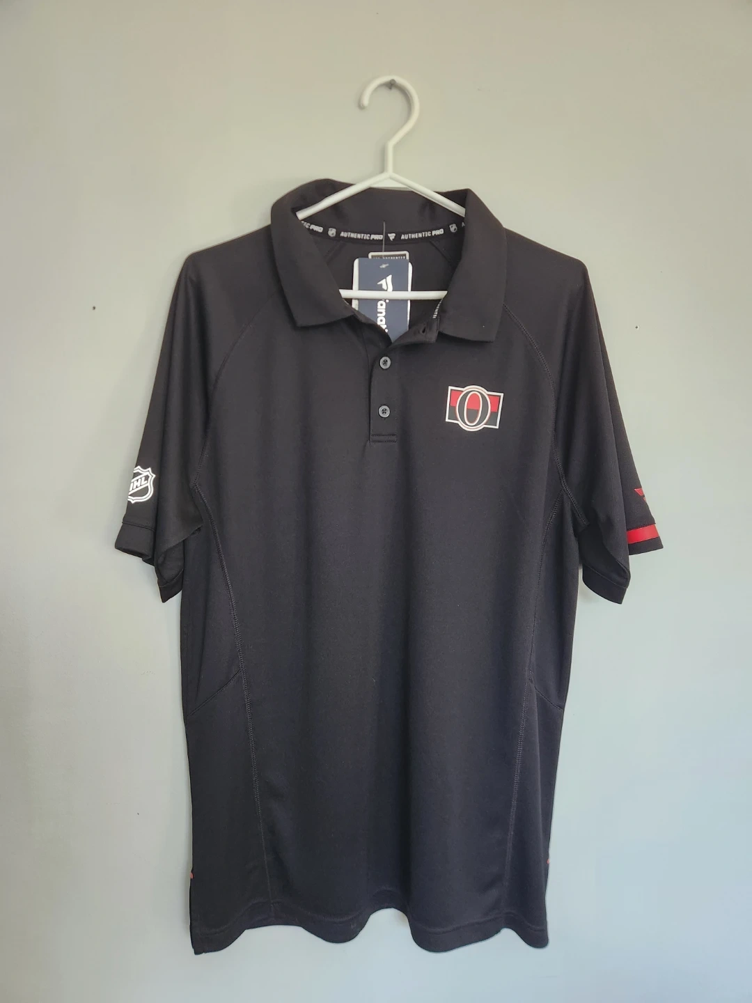 Show your support with this black Ottawa Senators polo shirt. It features the team logo on the chest and the NHL Authentic Pro branding. Made with comfortable, breathable fabric. Size is large.