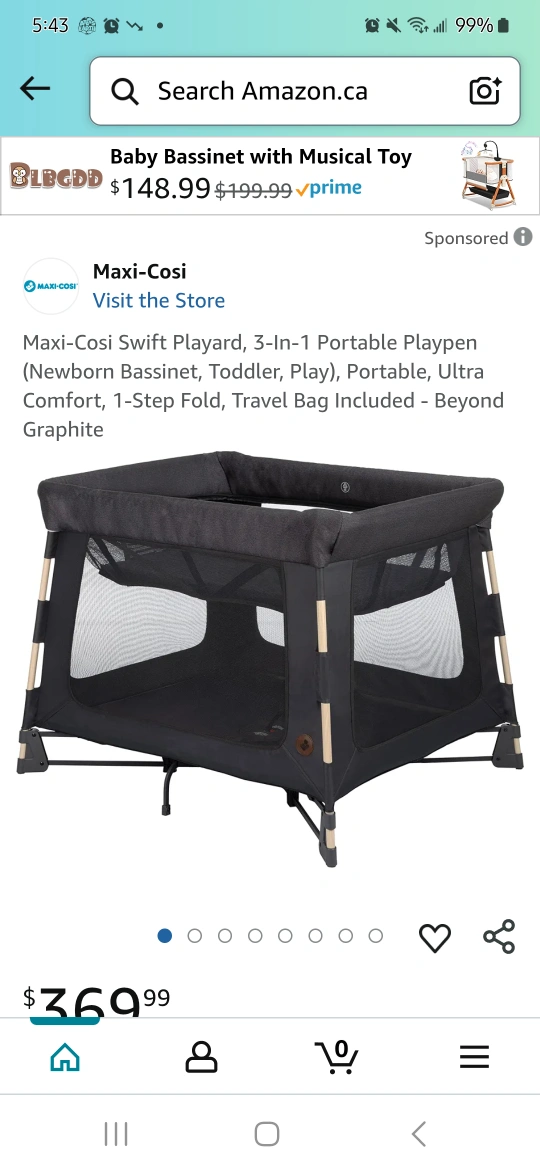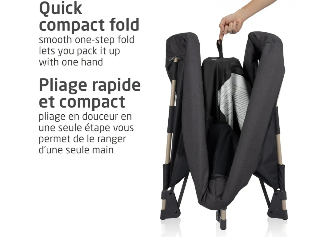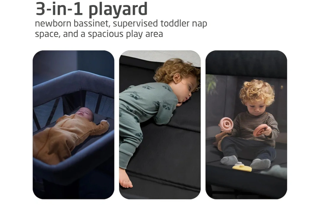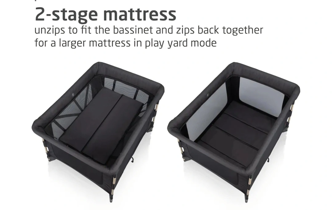 Three-in-one portable playpen. Newborn bassinet, toddler nap space, and play area. Two-stage mattress included. Unzips to fit bassinet and zips back together for larger mattress. One-step fold. Includes travel bag. **BRAND NEW STILL IN BOX** NEVER OPENED