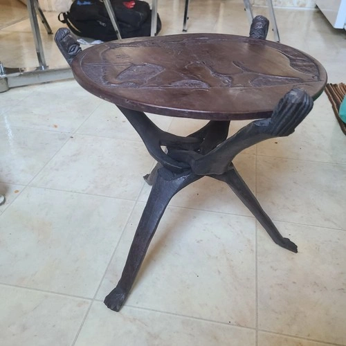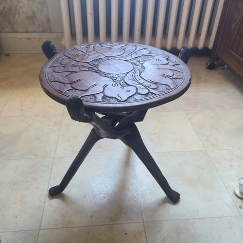 This is a beautiful dark wood tripod table brought from Malawi. The round top is reversible, with an elephant on one side, and an elephant, hippo, and rhino on the other. The legs are also very unique. It's light and easily portable, measuring a little over 1 ft. high, with the tabletop 13" in diameter.