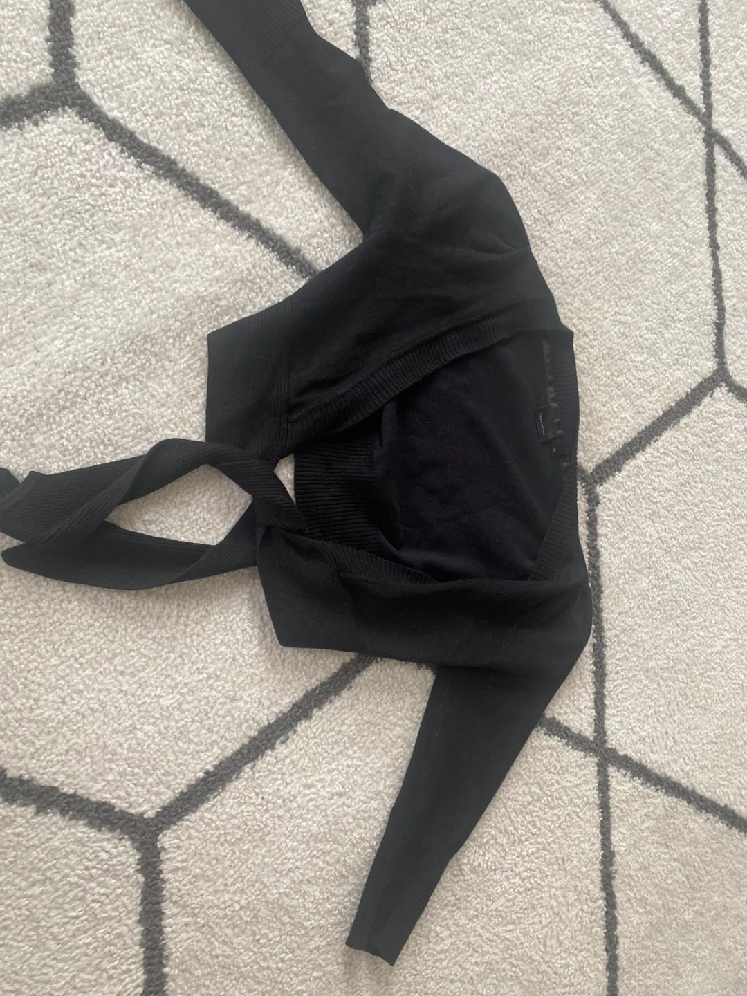A black wrap-style cardigan with long sleeves. Made from a ribbed knit material. Perfect for layering over an outfit.