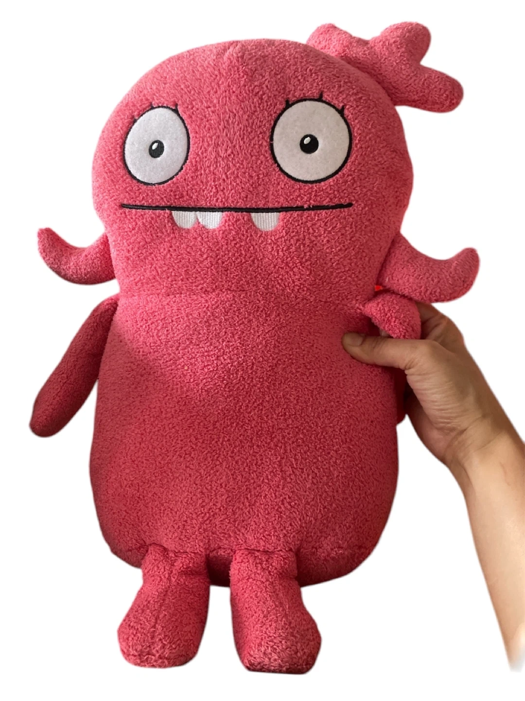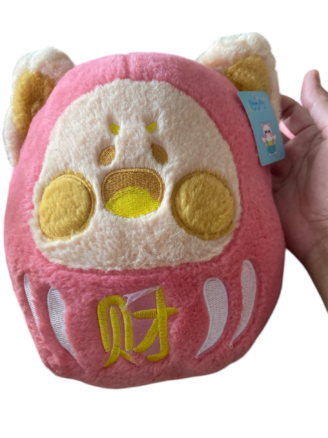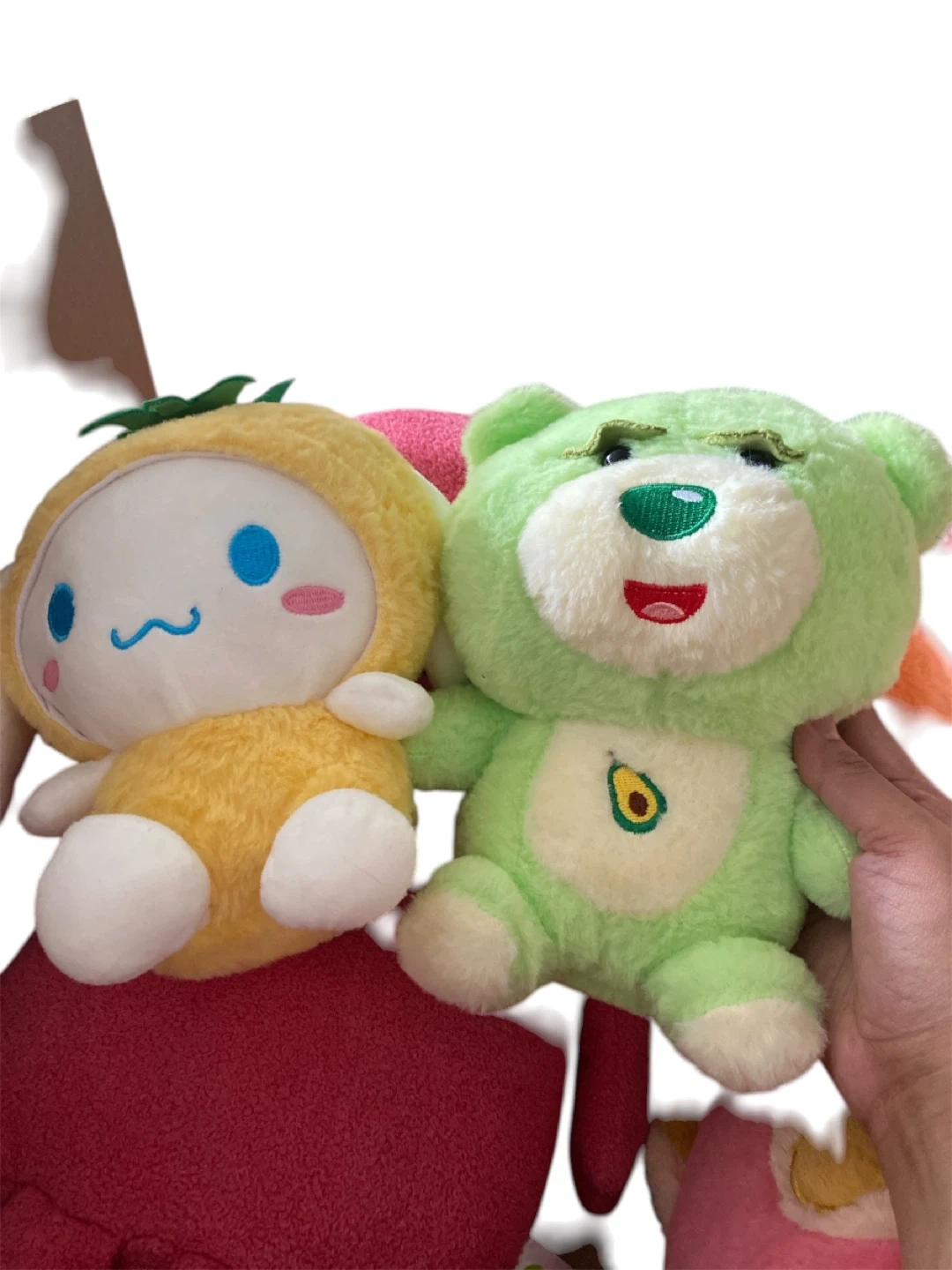 A collection of six fuzzy plush toys. Includes a pink Pikachu-like character, an orange ninja-like character, a pink Daruma doll with Japanese writing, a pink monster, a green avocado bear, and a yellow character with a fruit-like hat. These stuffed toys are soft and colourful.