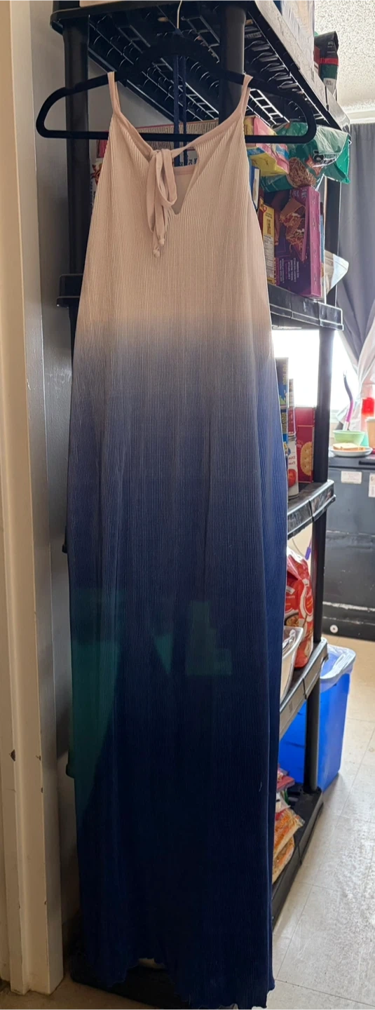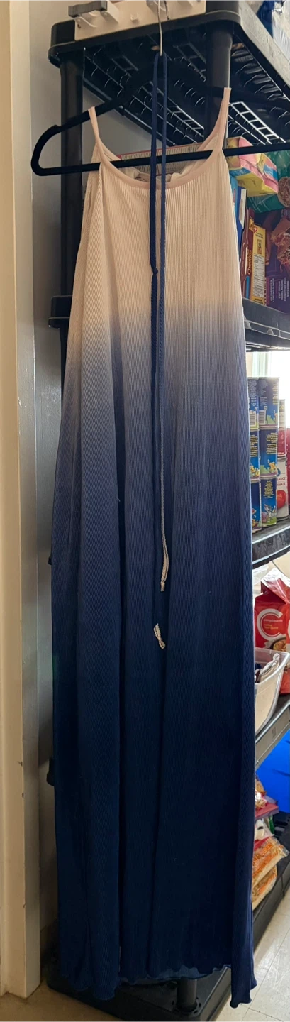 This is a long, pleated dress with a beautiful ombre design, fading from cream to navy blue. It has an empire style and a flowy silhouette. It's made of a lightweight, ribbed fabric perfect for warm weather.