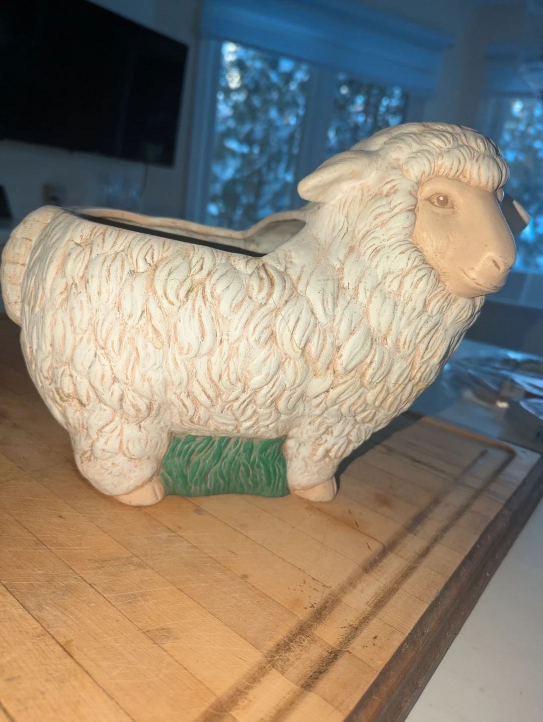 Charming sheep-shaped planter pot, perfect for adding a whimsical touch to your home decor. Ceramic material with a textured finish. This pot is great for small houseplants or succulents!